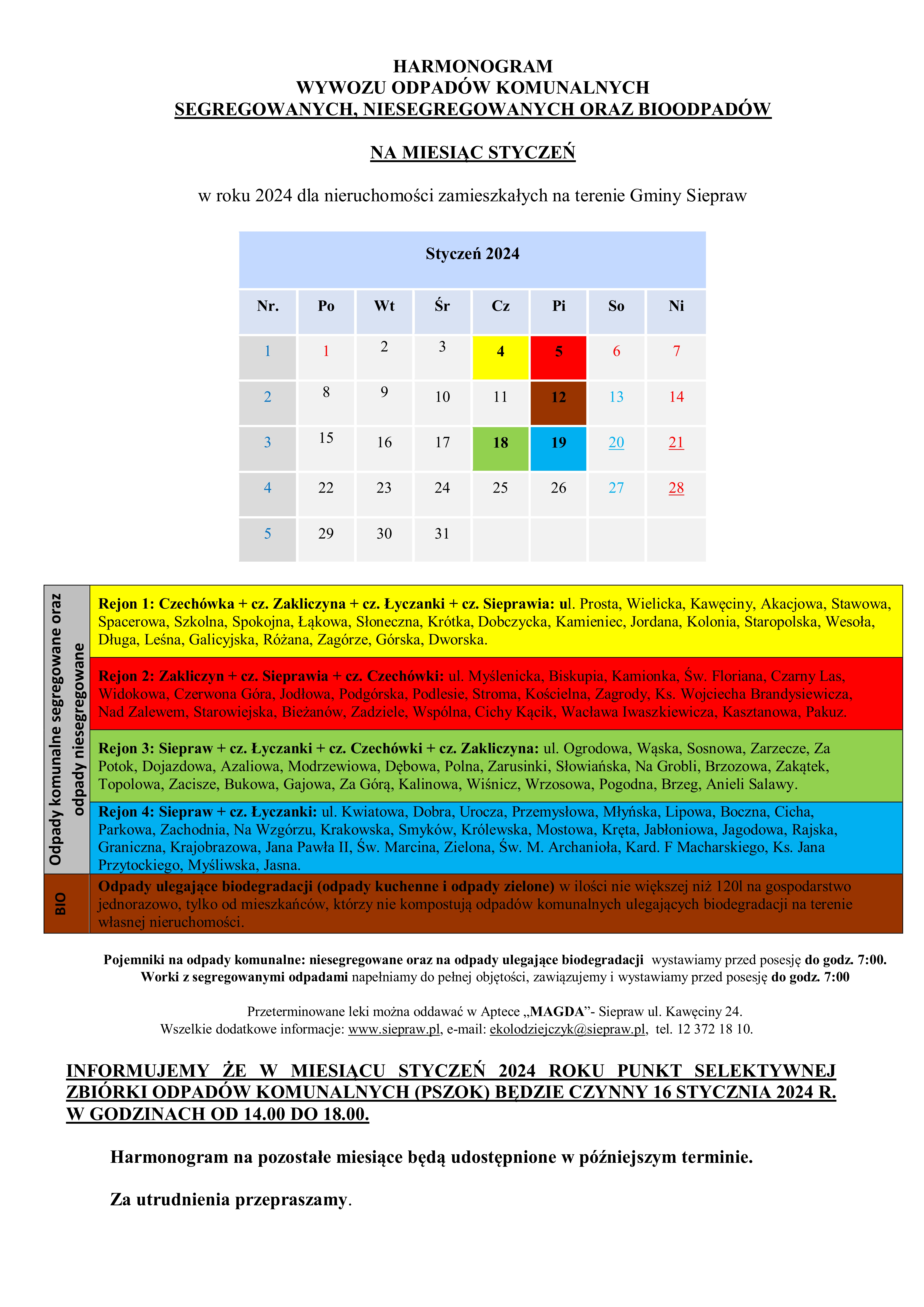Harmonogram wywozu odpadów komunalnych segregowanych, niesegregowanych oraz bioodpadów na miesiąc styczeń 2024.