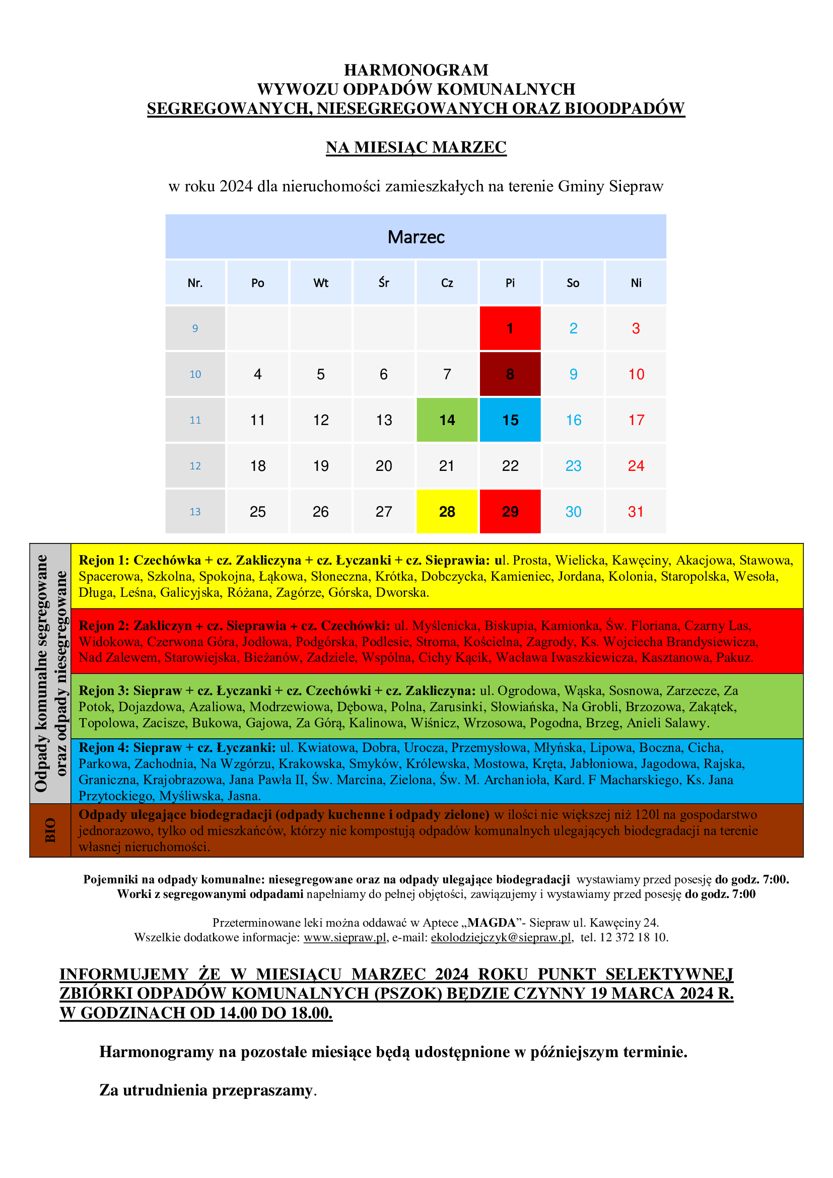 Harmonogram wywozu odpadów komunalnych segregowanych, niesegregowanych oraz bioodpadów na miesiąc marzec 2024.