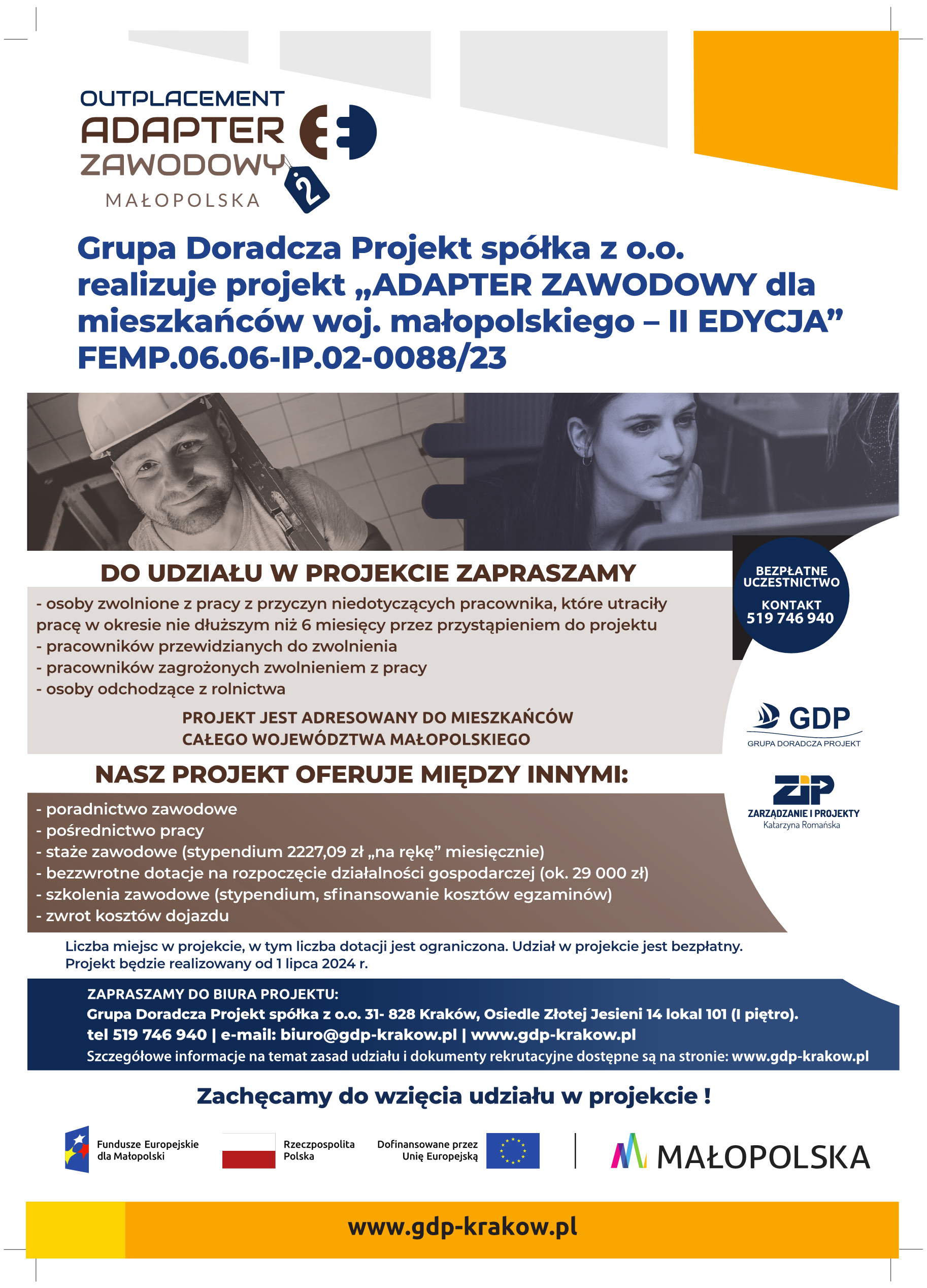 31 lipca 2024 r. rozpoczyna rekrutację do PROJEKTU OUTPLACEMENTOWEGO: „ADAPTER ZAWODOWY dla mieszkańców woj. małopolskiego – II EDYCJA” numer projektu: FEMP.06.06-IP.02-0088/23.