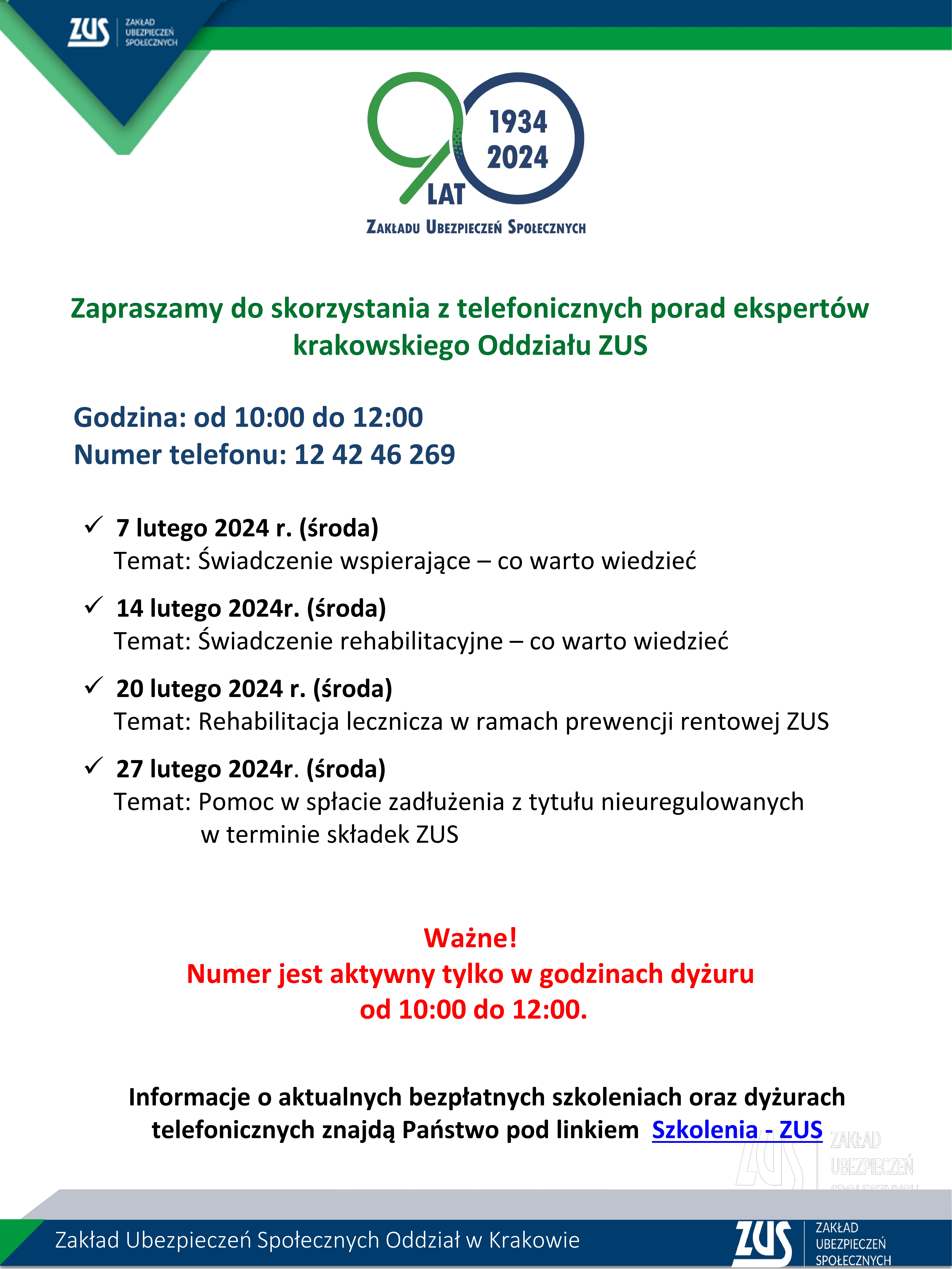 Informacja dotycząca dyżurów telefonicznych dla klientów ZUS organizowanych w lutym