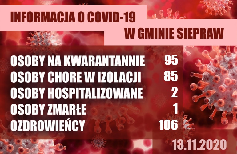 Informacja Państwowego Powiatowego Inspektora Sanitarnego w Myślenicach dotycząca ilości osób przebywających na kwarantannie, w izolacji, hospitalizowanych i ozdrowieńców w dniu 13 listopada 2020 r.