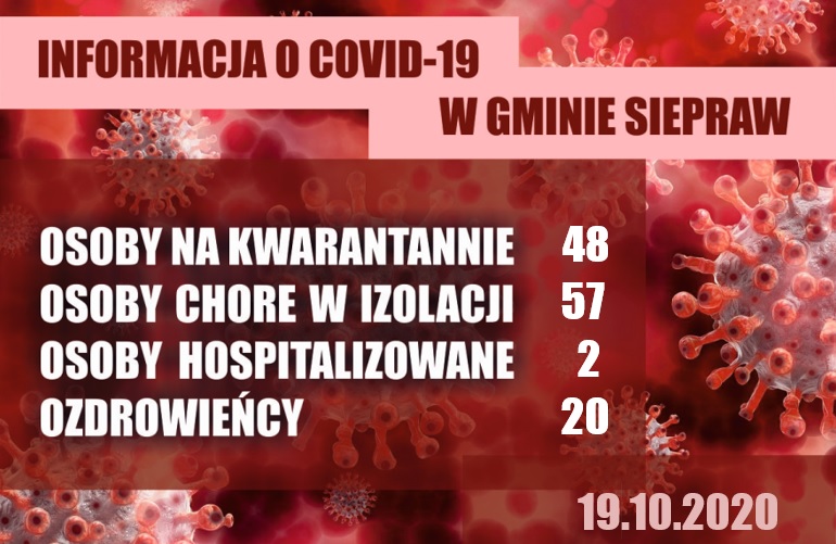 Informacja Państwowego Powiatowego Inspektora Sanitarnego w Myślenicach dotycząca ilości osób przebywających na kwarantannie, w izolacji, hospitalizowanych i ozdrowieńców w dniu 19 października 2020 r.
