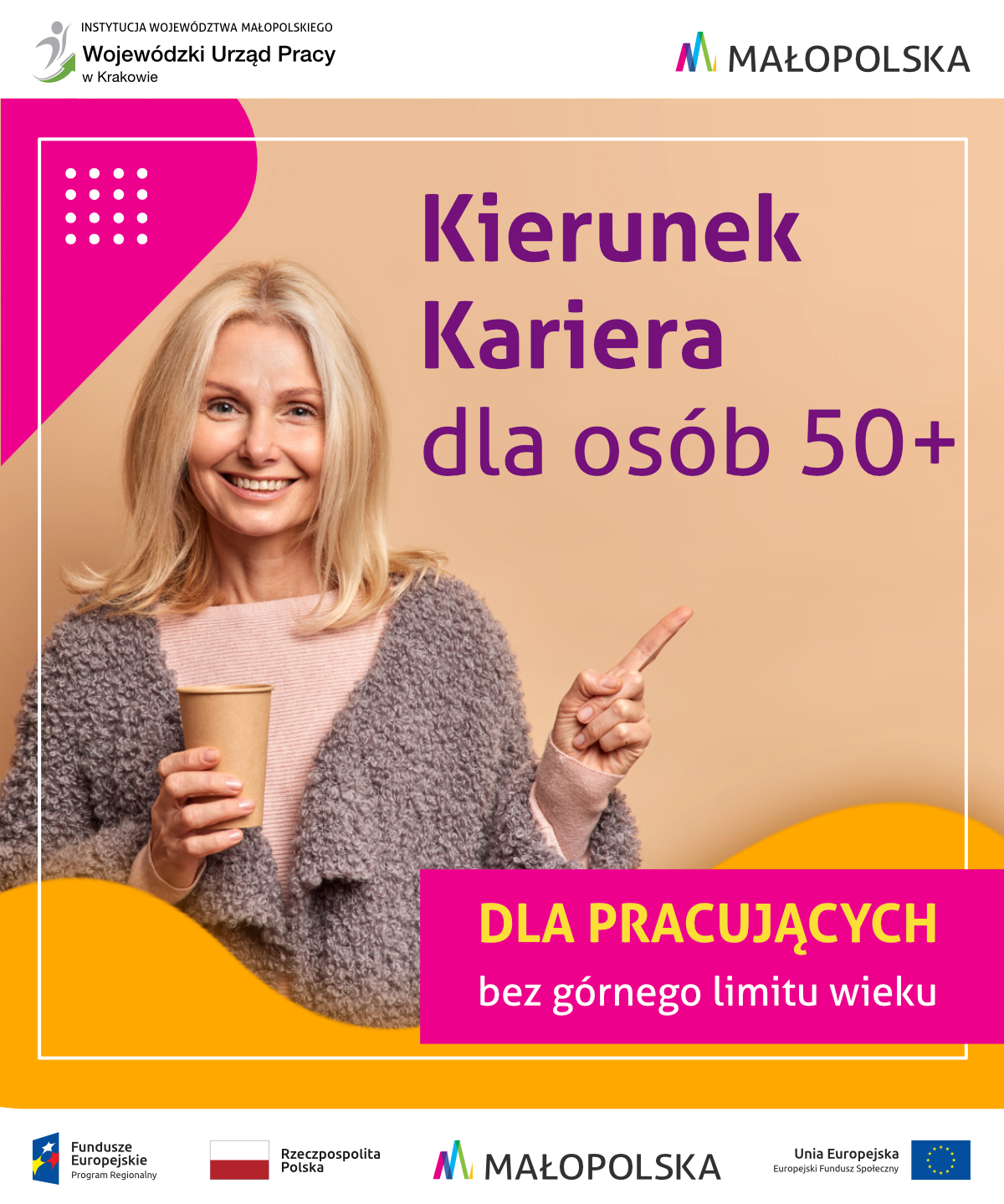 Zachęcamy do skorzystania z dotacji na szkolenia językowe, informatyczne, kursy prawa jazdy (prawie wszystkich kategorii) oraz szkolenia zawodowe (m.in. kursy operatora koparek, wózków widłowych, kursy kosmetyczne, księgowe, administracyjne trenerskie i wiele innych) realizowane w ramach projektów Kierunek Kariera i Kierunek Kariera Zawodowa. Aktualnie z dotacji mogą korzystać wyłącznie osoby w wieku 50+.
