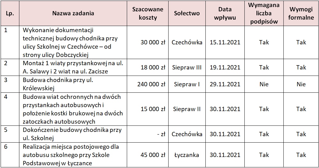 Wójt dokonał wstępnej kwalifikacji złożonych wniosków do pod względem formalnym (termin złożenia, liczba podpisów oraz poprawność uzupełnienia wniosku). Wszystkie wnioski, które zostały prawidłowo złożone zostaną przekazane pod obrady zebrań wiejskich.