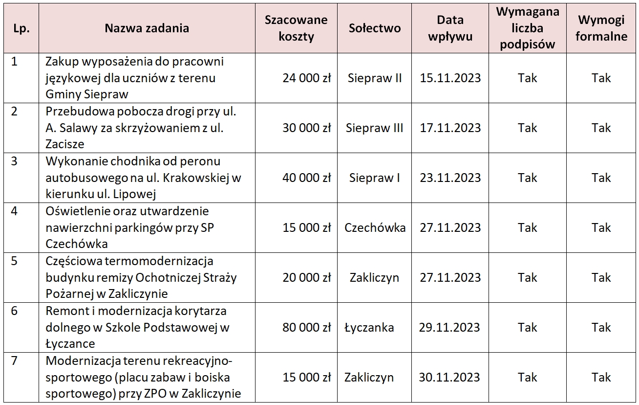 Wójt Gminy Siepraw dokonał wstępnej kwalifikacji złożonych wniosków pod względem formalnym (termin złożenia, liczba podpisów oraz poprawność uzupełnienia wniosku). Wszystkie wnioski zostały prawidłowo złożone i zostaną przekazane pod obrady zebrań wiejskich.