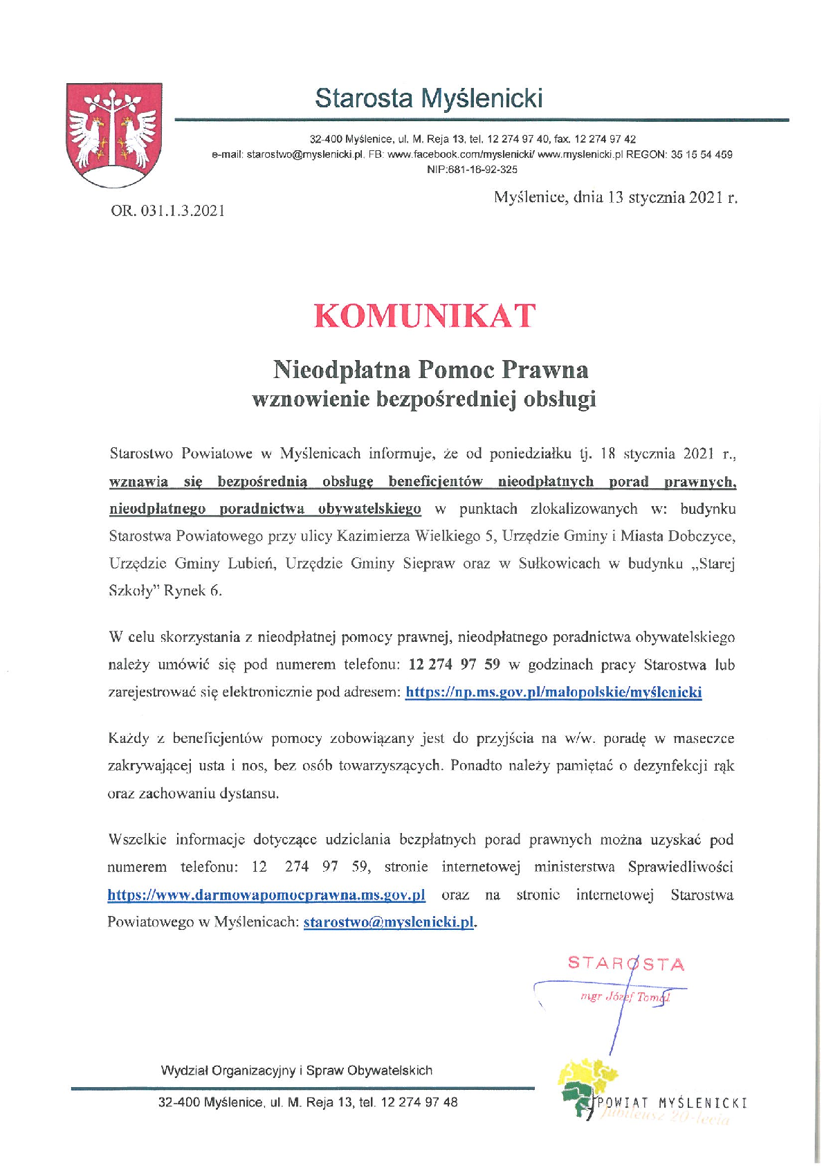 Starostwo Powiatowe w Myślenicach informuje, iż wznawia bezpośrednią obsługę beneficjentów nieodpłatnych porad prawnych, nieodpłatnego poradnictwa obywatelskiego.