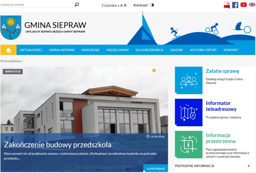 Wygląd i menu strony są tak zaprojektowane, aby w jak najprostszy sposób dotrzeć do interesujących treści. Najczęściej odwiedzane podstrony wyróżnione są piktogramami, których kliknięcie spowoduje bezpośrednie przeniesienie do właściwego miejsca.