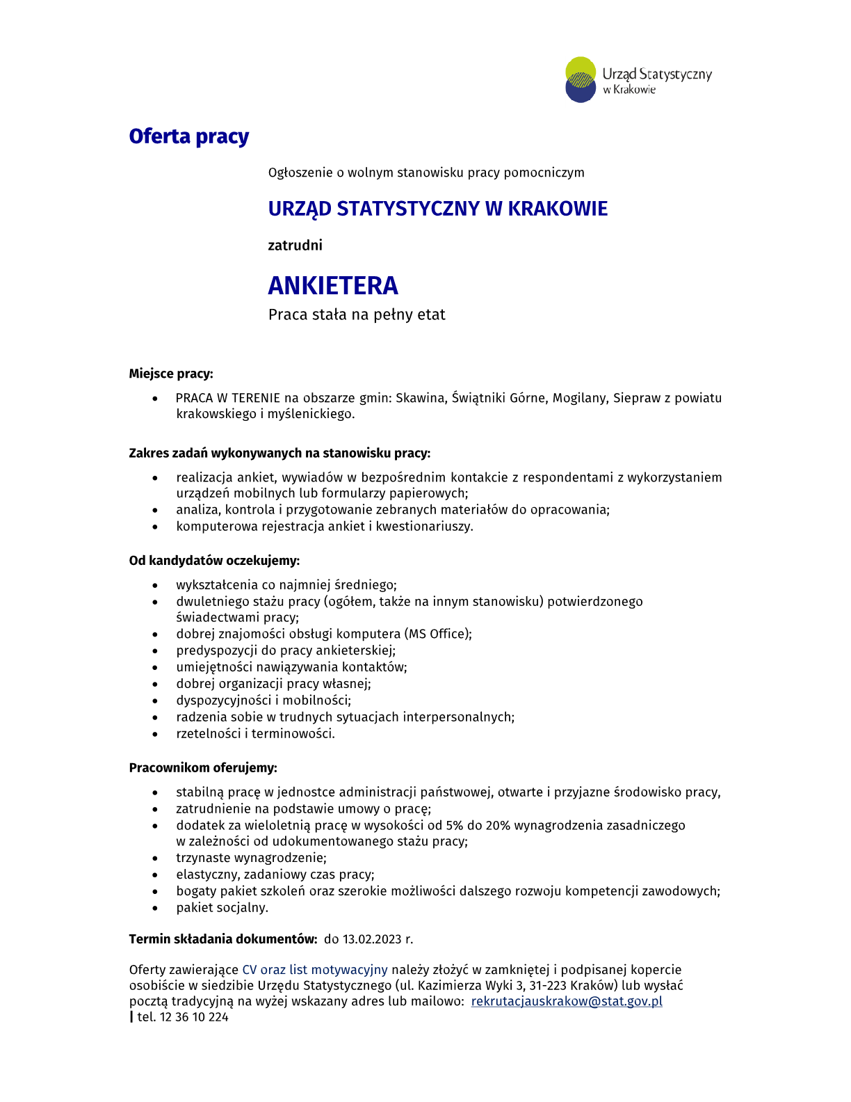 Urząd Statystyczny w Krakowie zatrudni Ankietera - PRACA