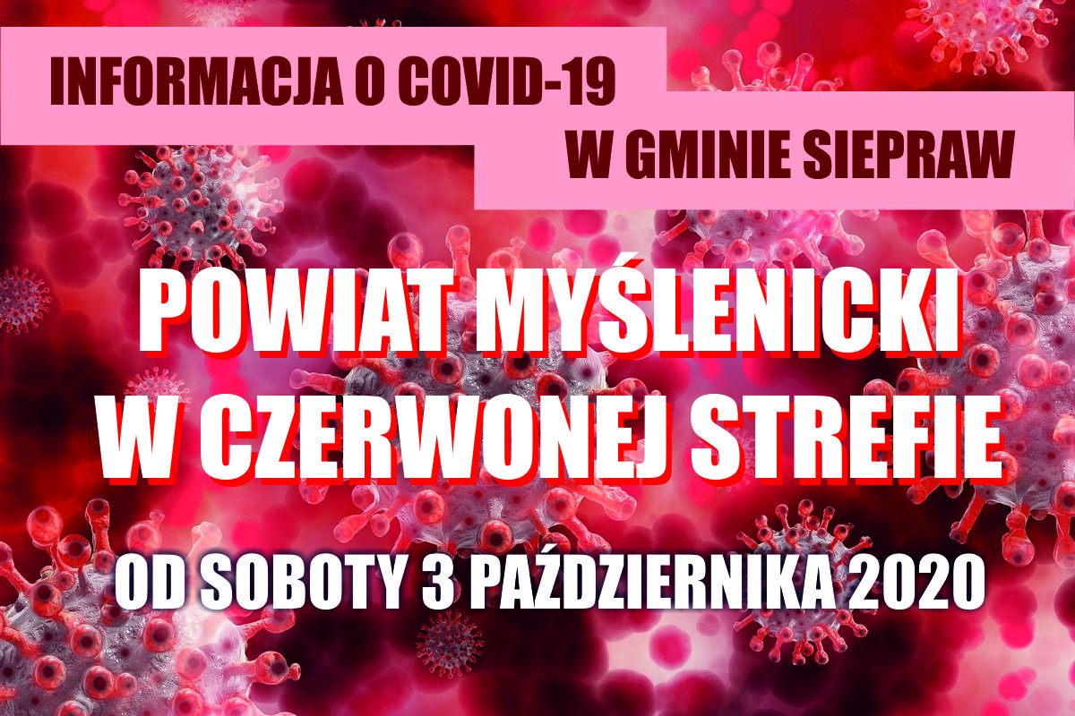 W wyniku wzrostu zakażeń COVID-19 Powiat Myślenicki od najbliższej soboty (3 października2020 r.) zostanie objęty „czerwoną strefą”. Z faktu tego wynikają kolejne obostrzenia i zalecenia dla mieszkańców.