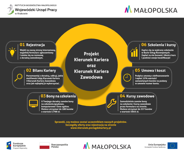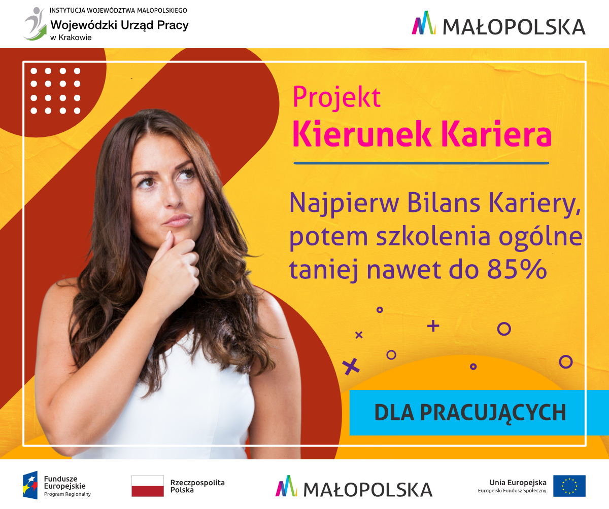 Chcesz nauczyć się języka? Skończyć kurs prawa jazdy? Zdobyć nowe umiejętności? Jeśli tak, to mamy dla Ciebie propozycję. Wojewódzki Urząd Pracy w Krakowie realizuje projekt „Kierunek Kariera”. Dzięki niemu uczestnik wybranego przez siebie szkolenia lub kursu ma opłacone do 85% jego kosztów. Sam płaci więc tylko niewielką część ceny.