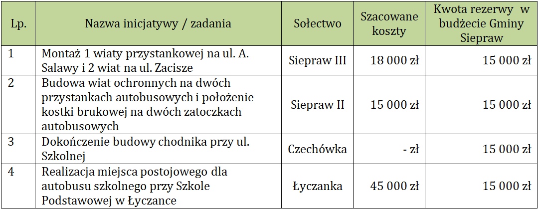 Inicjatywy obywatelskie wybrane do realizacji w ramach rezerwy celowej sołectw budżetu Gminy Siepraw w roku 2022: