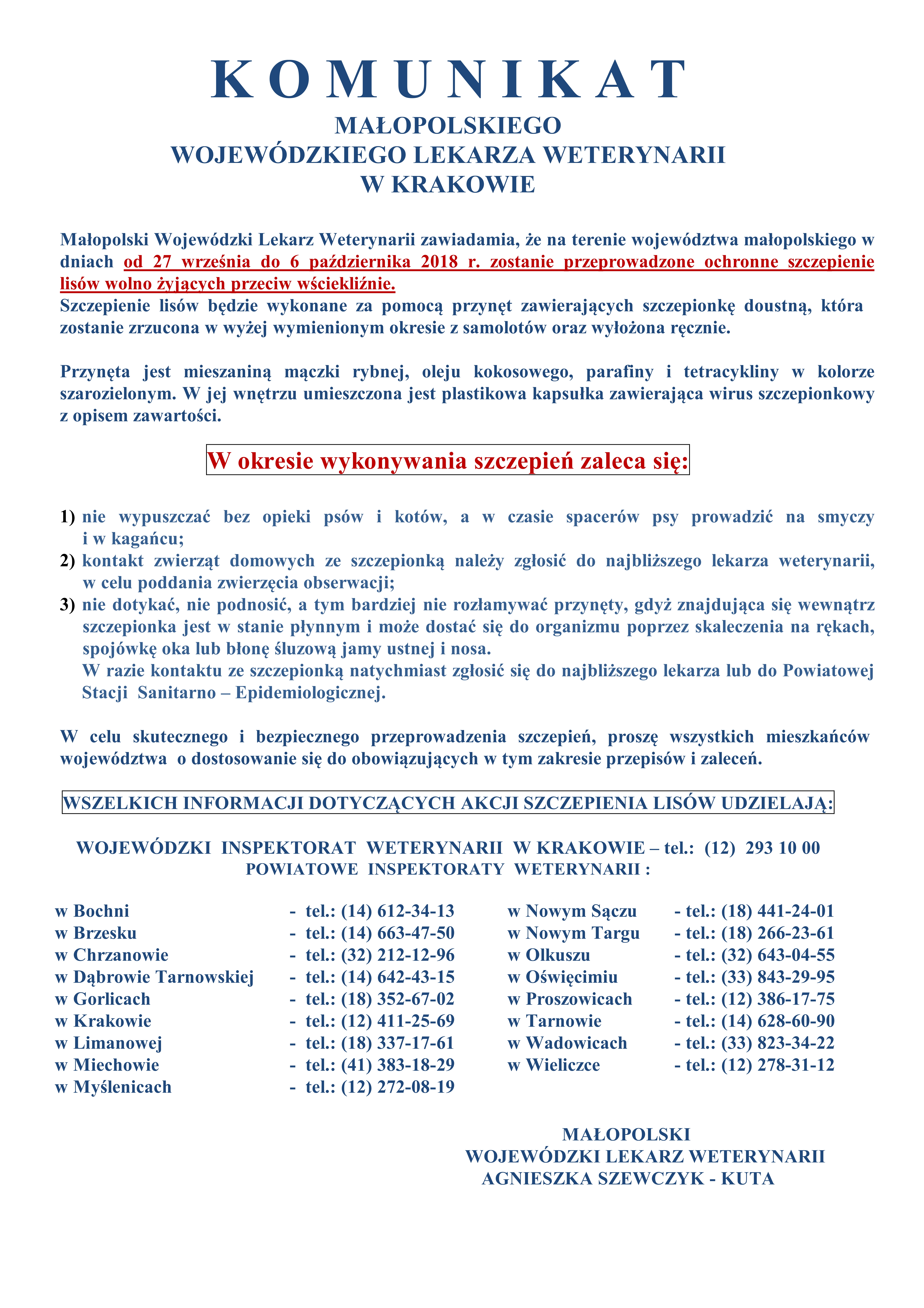 Komunikat Małopolskiego Wojewódzkiego Lekarza Weterynarii w Krakowie oraz wskazówki dla mieszkańców dotyczące postępowania w trakcie prowadzenia ochronnych szczepień.