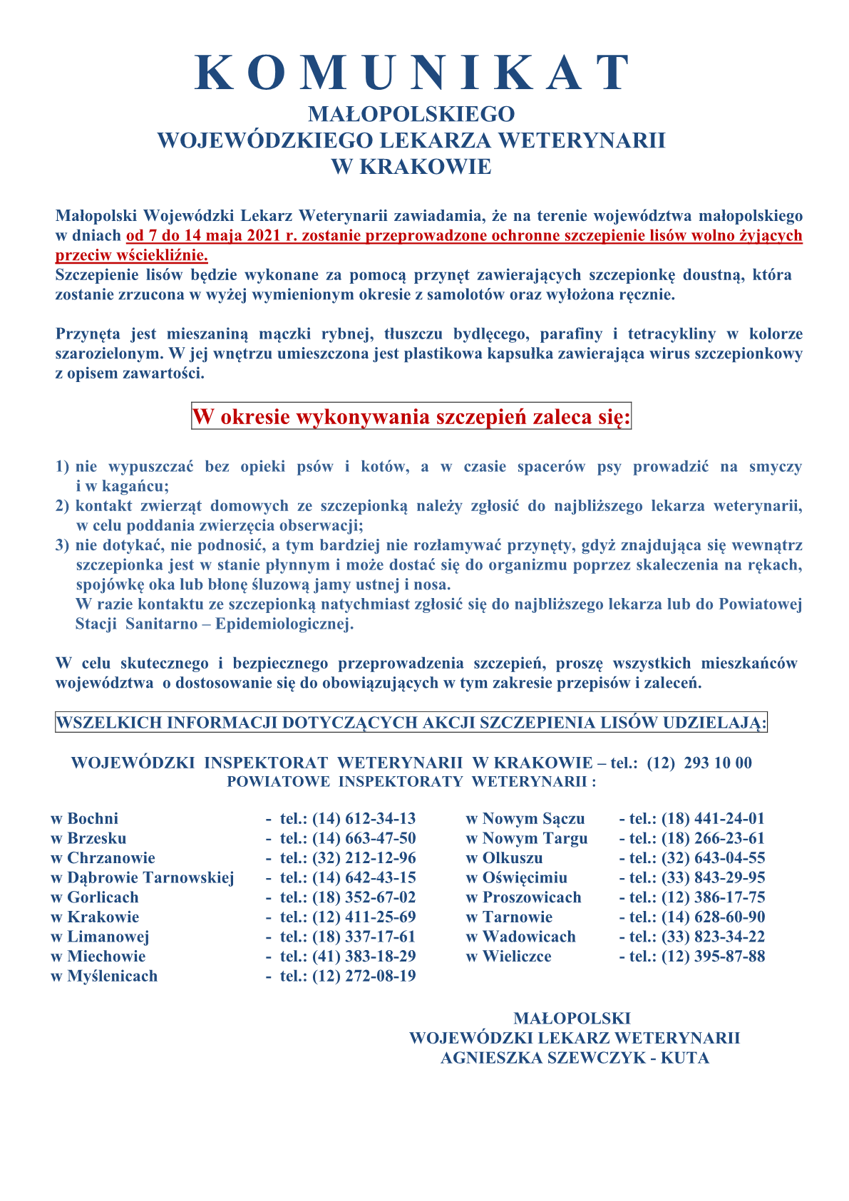 Powiatowy Lekarz Weterynarii w Myślenicach informuje, że w dniach od 7 do 14 maja 2021 roku, na terenie województwa małopolskiego zostanie przeprowadzona wiosenna akcja szczepienia lisów wolno żyjących przeciwko wściekliźnie.