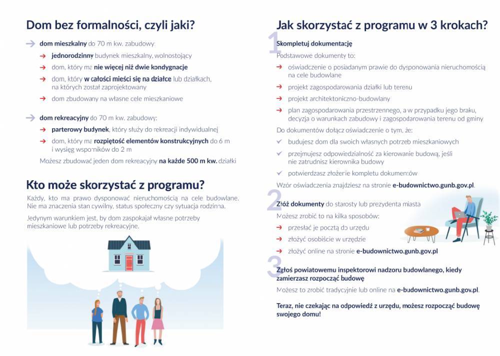 Program #DomBezFormalności wszedł w życie z początkiem stycznia 2022 r. Wprowadza znaczące ułatwienia w budowie domów do 70 m kw. powierzchni zabudowy. Dzięki programowi każdy, kto ma działkę budowlaną, może wybudować na niej ‒ w uproszczonej procedurze ‒ dom do 70 m kw. powierzchni zabudowy w celach mieszkaniowych lub rekreacyjnych. W przypadku braku planu zagospodarowania przestrzennego warunki zabudowy wydawane są w 21 dni, a budowę można rozpocząć bezpośrednio po zgłoszeniu.