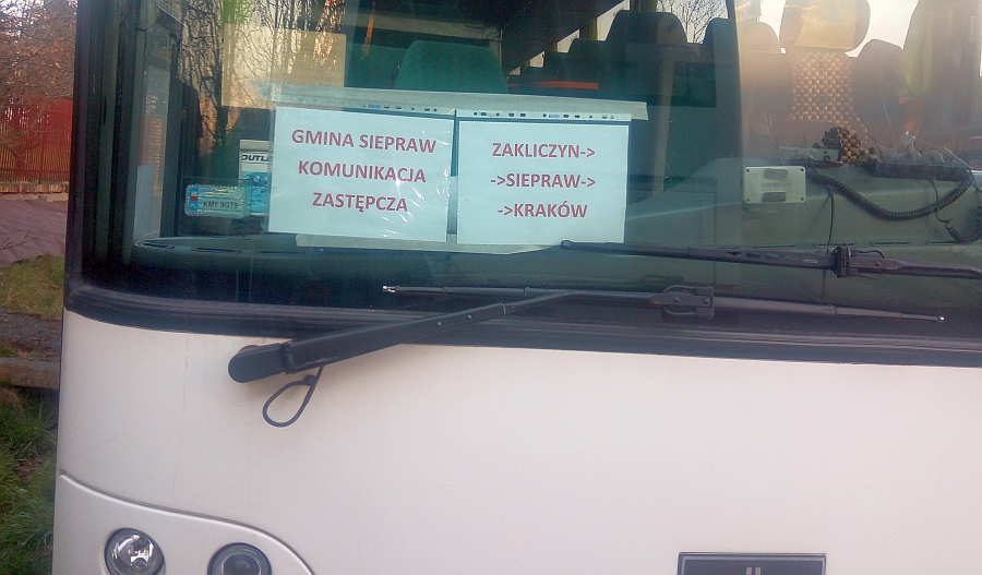 Odpowiednio oznakowany autobus firmy DOBTRANS (jak na zdjęciu) należy zatrzymać. Można autobusem zastępczym dojechać też do dowolnego przystanku po trasie do Krakowa (np. do Mogilan, Gaju). Kierowcy należy zgłosić, że będzie się wracało z tego samego przystanku po południu.