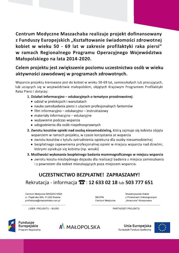 Centrum Medyczne Maszachaba realizuje wspólnie z Centrum Medycznym Skopia oraz Stowarzyszeniem Kobiet z Problemami Onkologicznymi „Amazonka" Krzeszowice projekt dofinansowany z Funduszy Europejskich: „Kształtowanie świadomości zdrowotnej kobiet w wieku 50 -69 lat w zakresie profilaktyki raka piersi" w ramach Regionalnego Programu Operacyjnego Województwa Małopolskiego na lata 2014-2020. Celem projektu jest zwiększenie poziomu uczestnictwa osób w wieku, aktywności zawodowej w programach zdrowotnych.