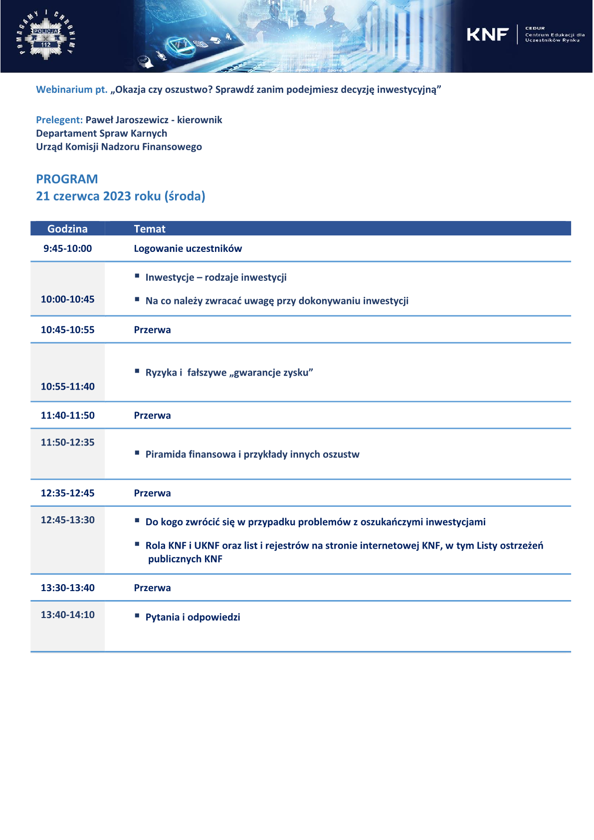 - Webinarium pt. Okazja czy oszustwo? Sprawdź zanim podejmiesz decyzję inwestycyjną zaplanowane na 21 czerwca br.