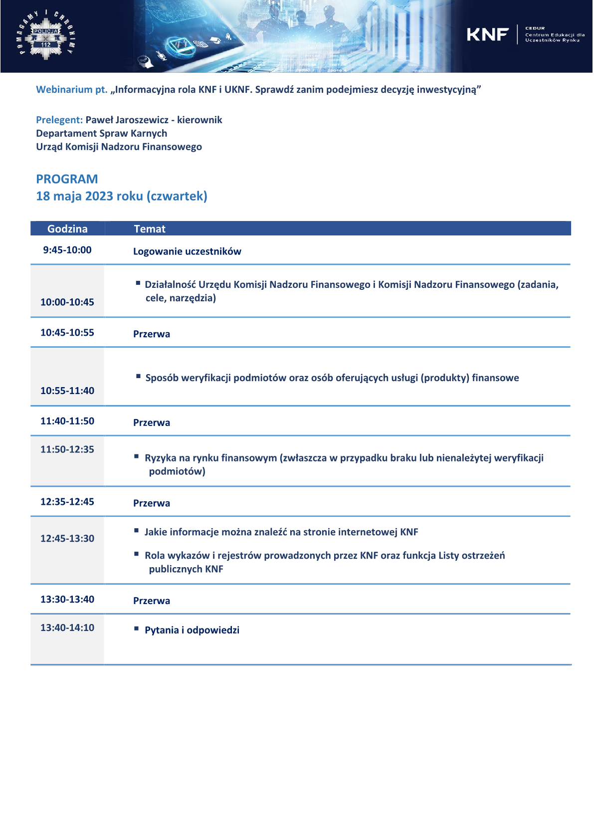 - Webinarium pt. Informacyjna rola KNF i UKNF. Sprawdź zanim podejmiesz decyzję inwestycyjną zaplanowane na 18 maja br.