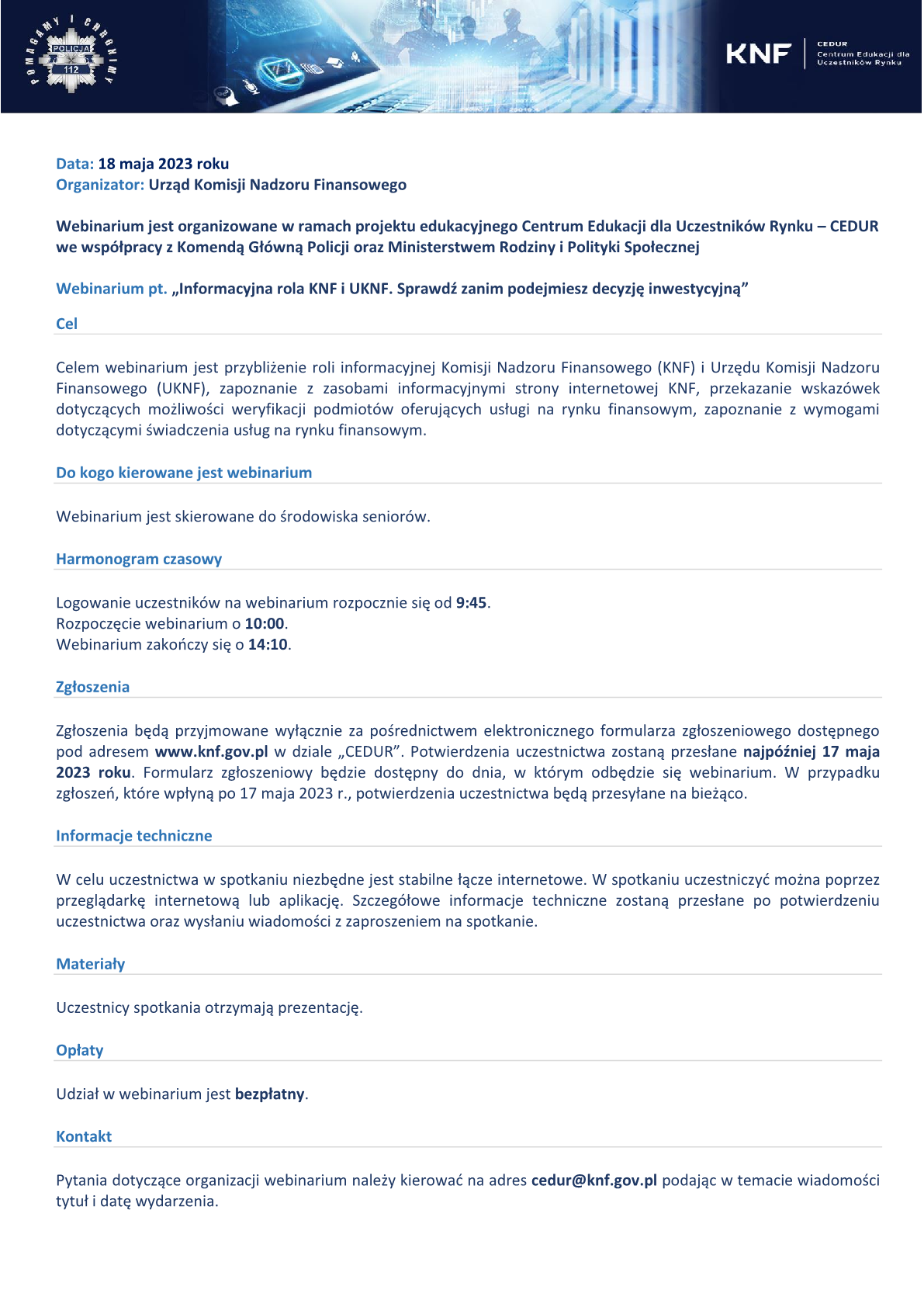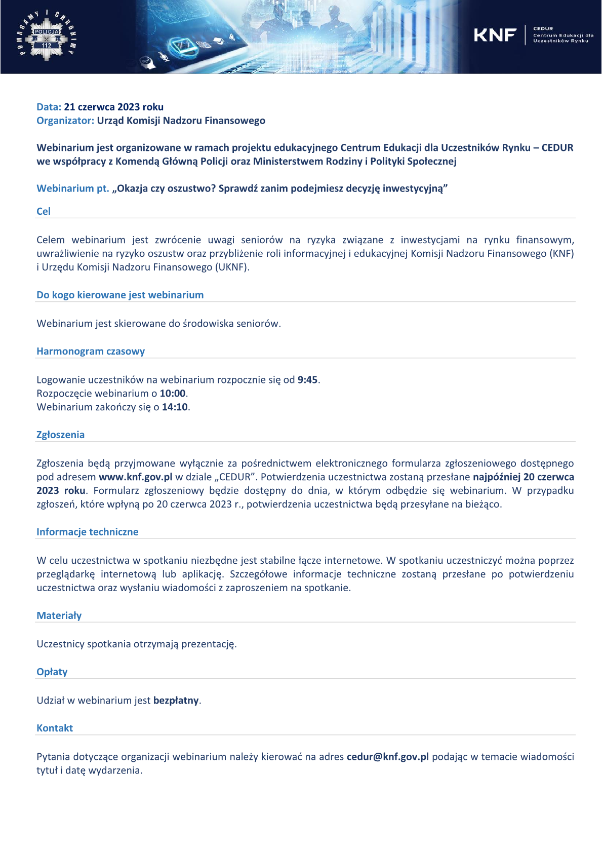 Urząd Komisji Nadzoru Finansowego, w ramach projektu edukacyjnego Centrum Edukacji dla Uczestników Rynku – CEDUR, we współpracy z Komendą Główną Policji oraz Ministerstwem Rodziny i Polityki Społecznej organizuje webinaria (seminaria online) dla seniorów: