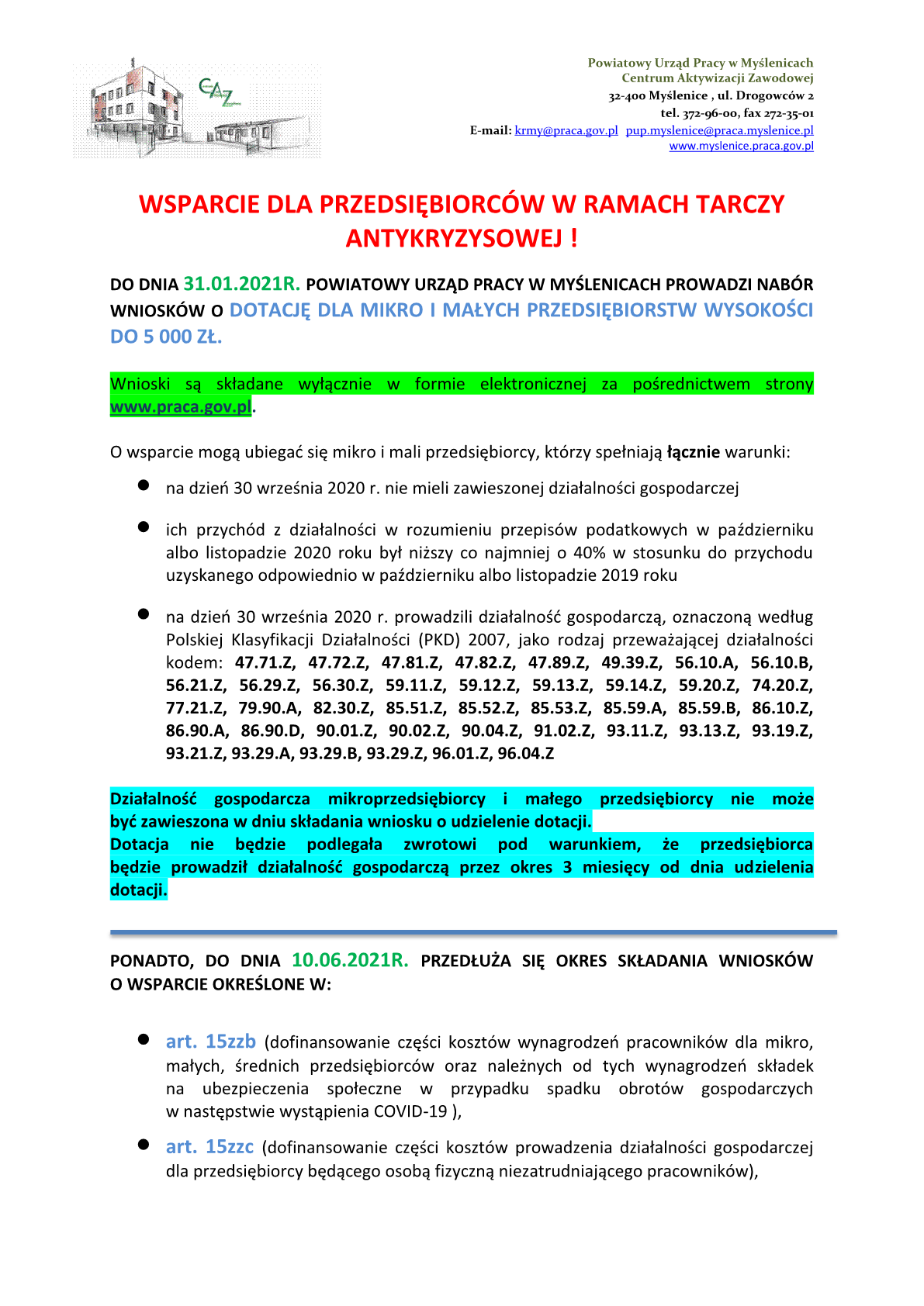 Do dnia 31.01.2021r. Powiatowy Urząd Pracy w Myślenicach prowadzi nabór wniosków o dotację dla mikro i małych przedsiębiorstw wysokości do 5 000zł.