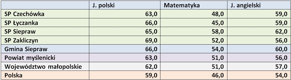 Spośród gminnych szkół egzamin z języka polskiego najlepiej napisali uczniowie ze Szkoły Podstawowej z Zakliczyna, natomiast z matematyki oraz języka angielskiego najlepsze wyniki osiągnęła Szkoła Podstawowa w Sieprawiu. Szczegółowe wyniki w poniższej tabeli oraz w załączonych plikach.