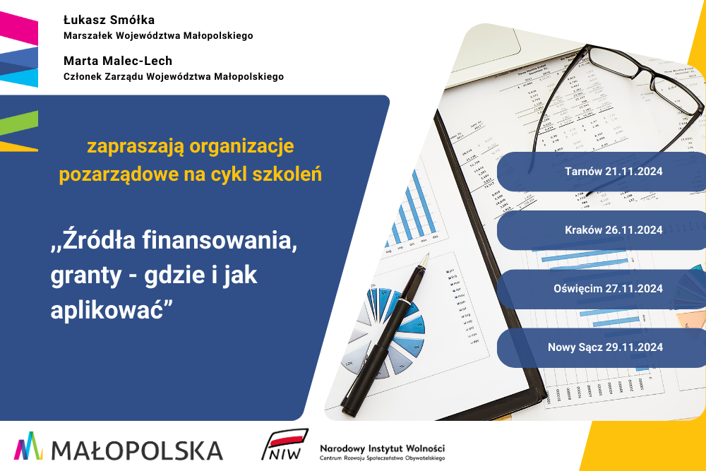 Województwo Małopolskie, doceniając rolę organizacji pozarządowych, które w sposób skuteczny i efektywny uzupełniają naszą samorzadową działalność na rzecz społeczności lokalnych, w listopadzie br. organizuje cykl szkoleń informacyjno – edukacyjnych pn. „Źródła finansowania, granty – gdzie i jak aplikować”.