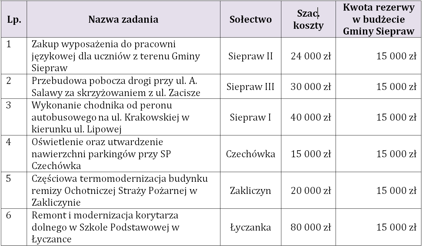 Inicjatywy obywatelskie wybrane do realizacji w ramach rezerwy celowej sołectw budżetu Gminy Siepraw w roku 2024: