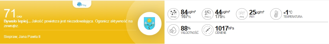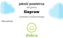 Inny widżet umiejscowiony został pod mapą, także na dole głównej strony Gminy Siepraw i informuje o bieżącym wskazaniu jednego z pięciu czujników Airly, zamontowanych w 2018 roku na terenie wszystkich miejscowości Gminy Siepraw. Informuje on w czasie rzeczywistym o stężeniu pyłów PM10, PM2,5, PM1 oraz o wilgotności, temperaturze i ciśnieniu powietrza.