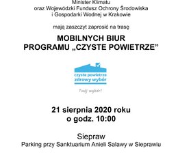 Minister Klimatu oraz Wojewódzki Fundusz Ochrony Środowiska i Gospodarki Wodnej w Krakowie mają zaszczyt zaprosić na trasę mobilnego biura programu „Czyste Powietrze” w Sieprawiu w dniu 21 sierpnia 2020 roku, godz. od 10:00 do 12.00. Mobilne biuro będzie mieściło się na parkingu przy Sanktuarium bł. Anieli Salawy w Sieprawiu.