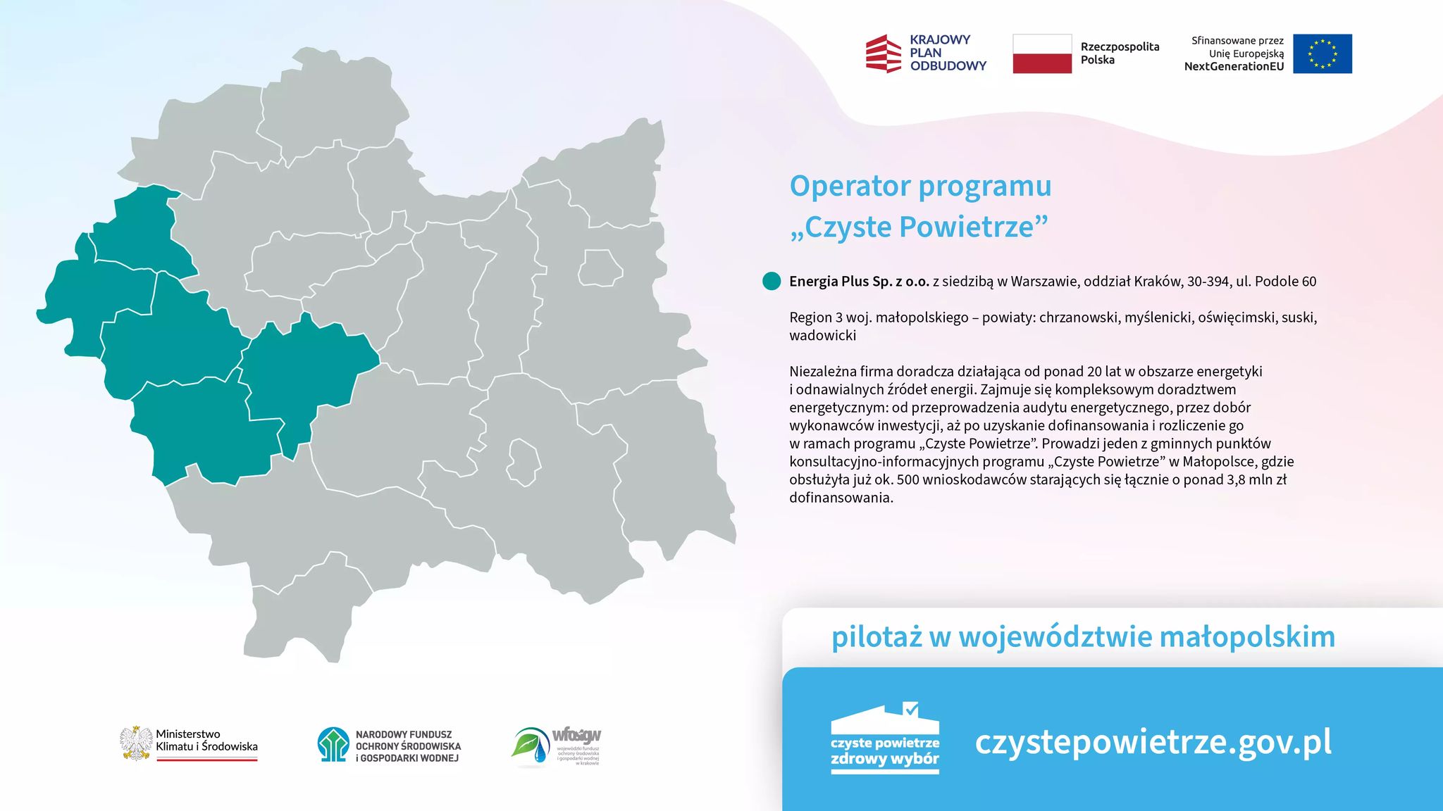 Narodowy Fundusz Ochrony Środowiska i Gospodarki Wodnej uruchomił w województwie małopolskim pierwszy w Polsce pilotaż dotyczący udziału Operatorów przy uzyskaniu dotacji z Programu „Czyste Powietrze”.