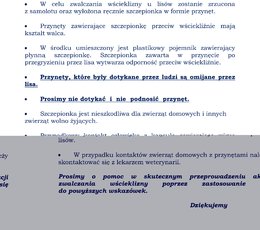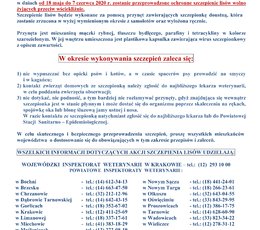 Powiatowy Lekarz Weterynarii w Myślenicach informuje, że w dniach od 18 maja do 7 czerwca 2020 roku, na terenie województwa małopolskiego zostanie przeprowadzona wiosenna akcja szczepienia lisów wolno żyjących przeciwko wściekliźnie. W załączeniu komunikat Małopolskiego Wojewódzkiego Lekarza Weterynarii w Krakowie oraz wskazówki dla mieszkańców dotyczące postępowania w trakcie prowadzenia ochronnych szczepień.