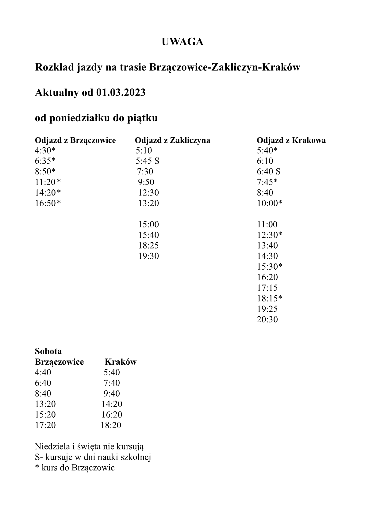 Busy na trasie Brzączowice- Zakliczyn-Kraków od 01.03.2023r.