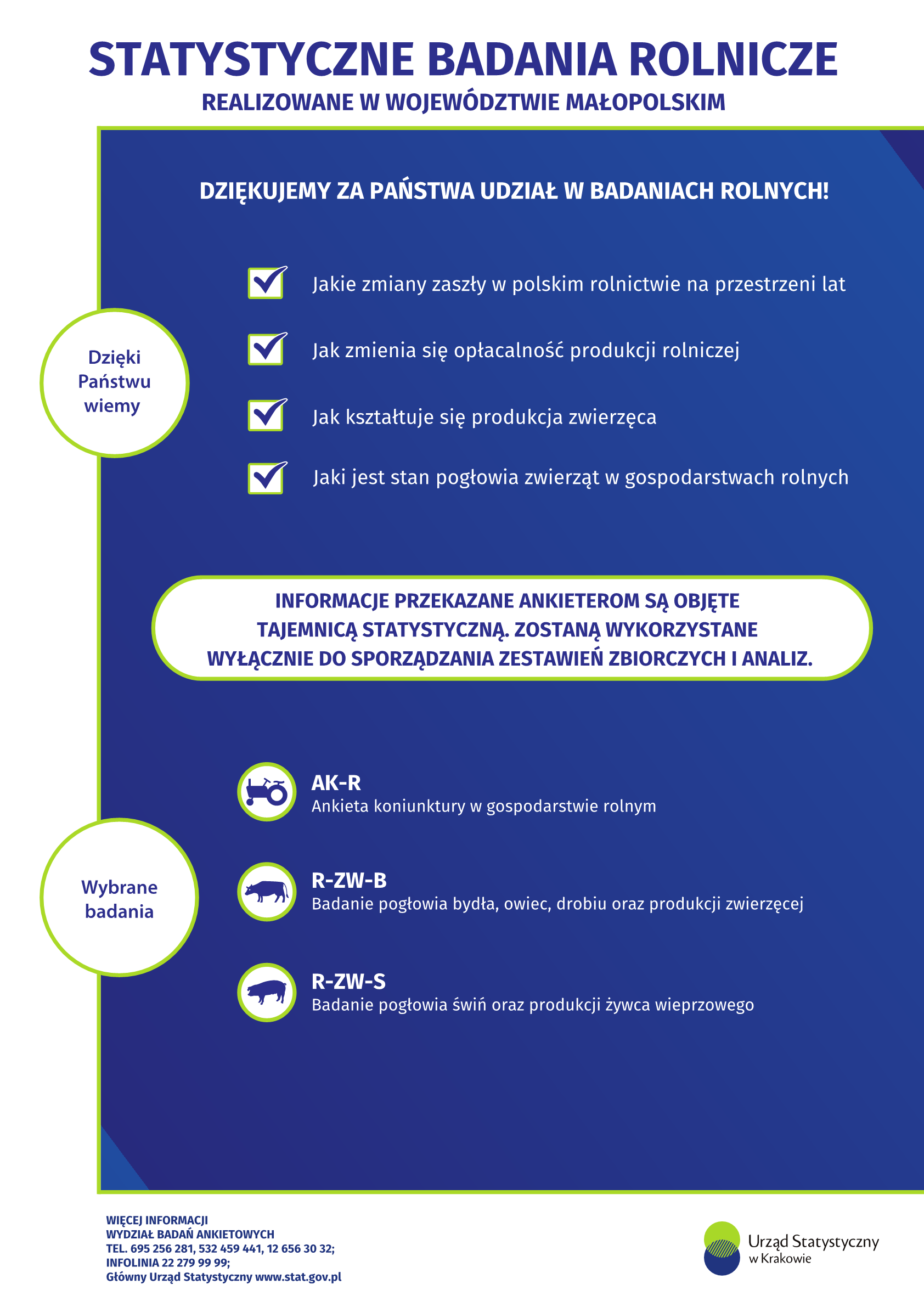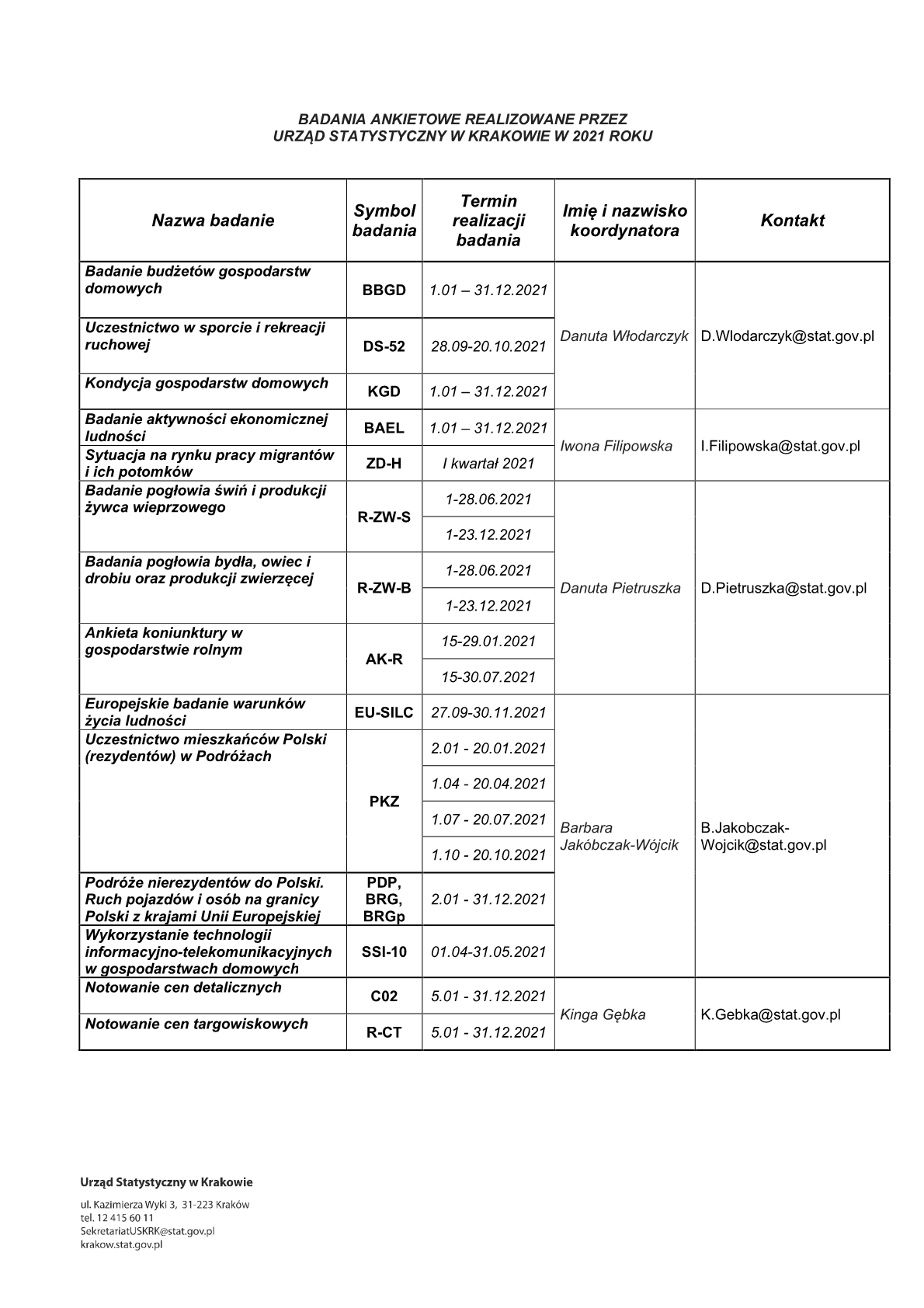 W trosce o wspólne zdrowie i bezpieczeństwo, z uwagi na sytuację epidemiczną, badania statystyczne w 2021 r. będą realizowane przez pracowników Urzędu Statystycznego w Krakowie głównie metodą wywiadu telefonicznego. W załączeniu przesyłam wykaz badań ankietowych planowanych do realizacji w 2021 r. Tożsamość ankieterów statystycznych można sprawdzić poprzez aplikację na stronie internetowej https://sa.stat.gov.pl/formularz/ lub telefonicznie pod numerami: +48 12 65 63 032, +48 695 256 281, +48 12 41 56 011.