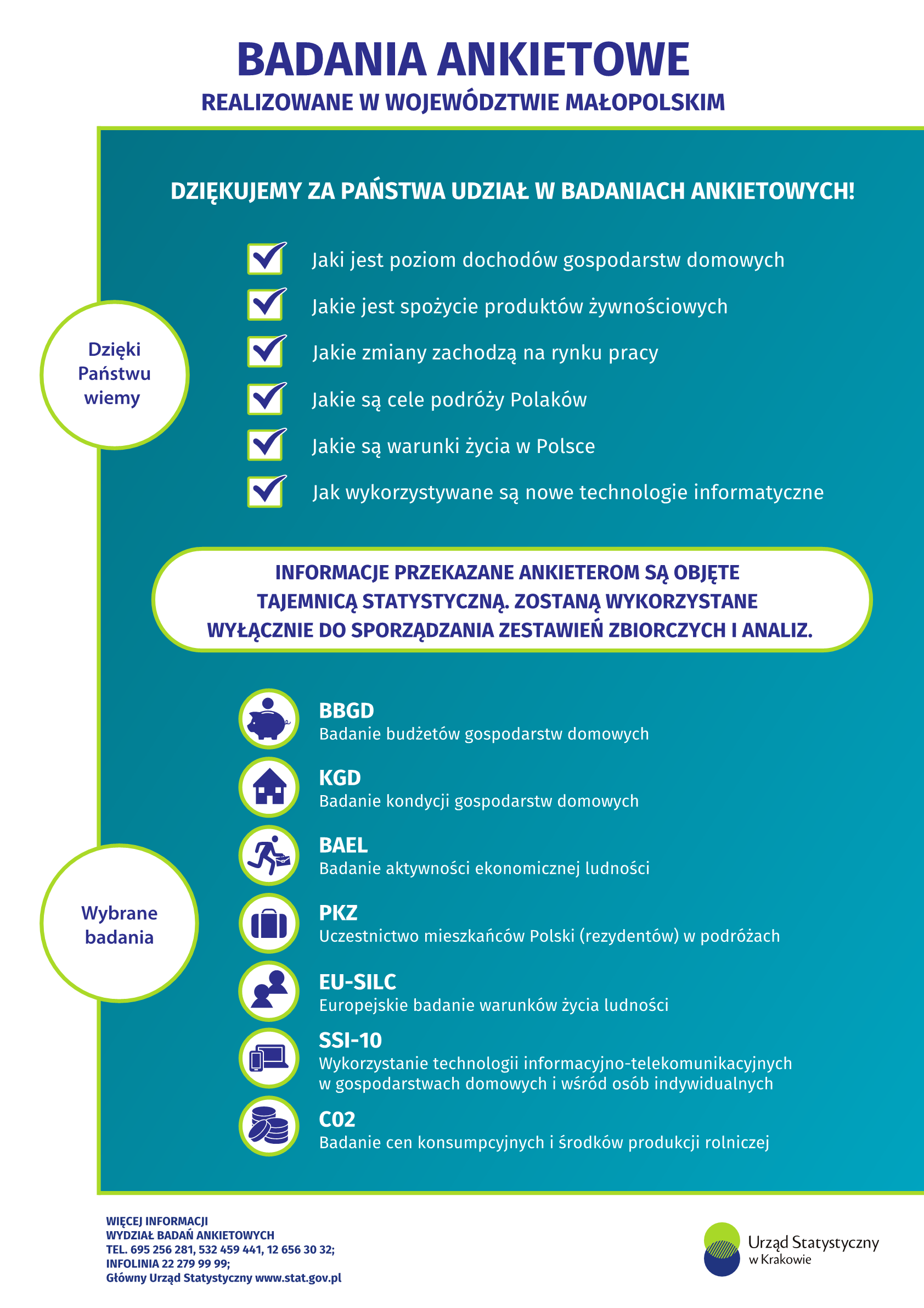 Pozyskane w badaniach statystycznych dane są wykorzystywane do analiz i opracowań zbiorczych dotyczących sytuacji społecznej i gospodarczej województwa małopolskiego oraz stanowią podstawę do podejmowania strategicznych decyzji ekonomicznych, społecznych i administracyjnych. Zbierane i gromadzone w badaniach dane indywidualne i osobowe są objęte tajemnicą statystyczną – są one należycie i starannie zabezpieczone oraz nie zostają nikomu ujawnione. Stosowane przez statystykę publiczną narzędzia oraz procedury w zakresie bezpieczeństwa danych zapewniają całkowitą ochronę gromadzonych informacji. Statystyka publiczna prezentuje jedynie dane wynikowe, których nie można powiązać z konkretnymi osobami.