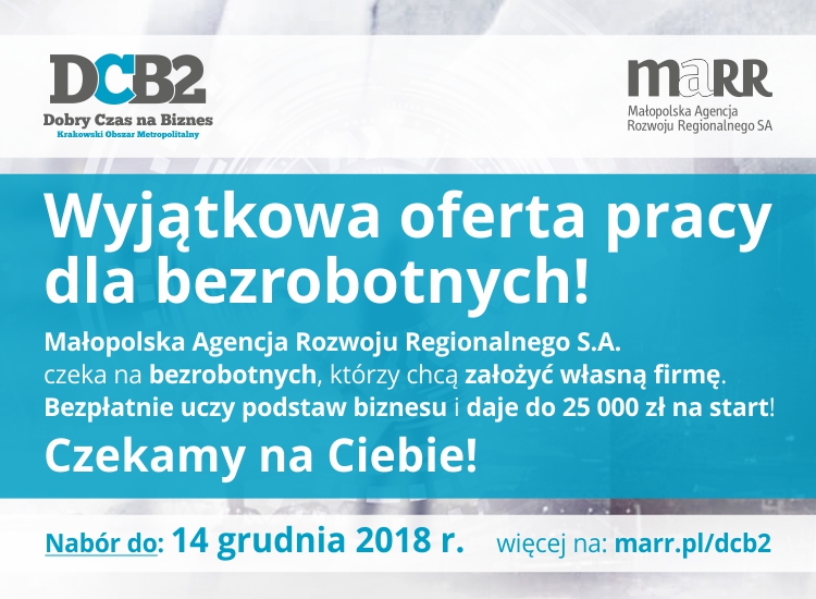 Małopolska Agencja Rozwoju Regionalnego S.A. ogłasza III nabór do projektu „Dobry Czas na Biznes –KOM2” w ramach 8 Osi Priorytetowej Rynek Pracy, Działanie 8.3 Wsparcie na zakładanie działalności gospodarczej, w Podziałaniu 8.3.1 Wsparcie na zakładanie działalności gospodarczej w formie dotacji, typ operacji A kompleksowe wsparcie dla zakładania działalności gospodarczej w formie dotacji.