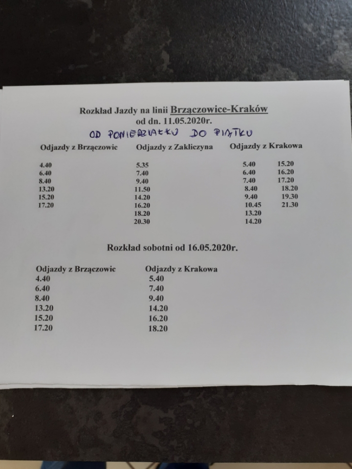 Informacja od przewoźnika - dodatkowe godziny kursów na trasie Brzączowice - Zakliczyn - Kraków