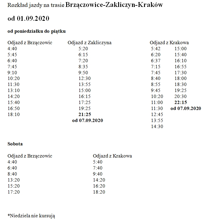 Na prośbę pasażerów od poniedziałku 07.09.2020 dokładamy jeden kurs z Zakliczyna do Krakowa: odjazd z Zakliczyna 21:25 oraz odjazd z Krakowa 22:15.
