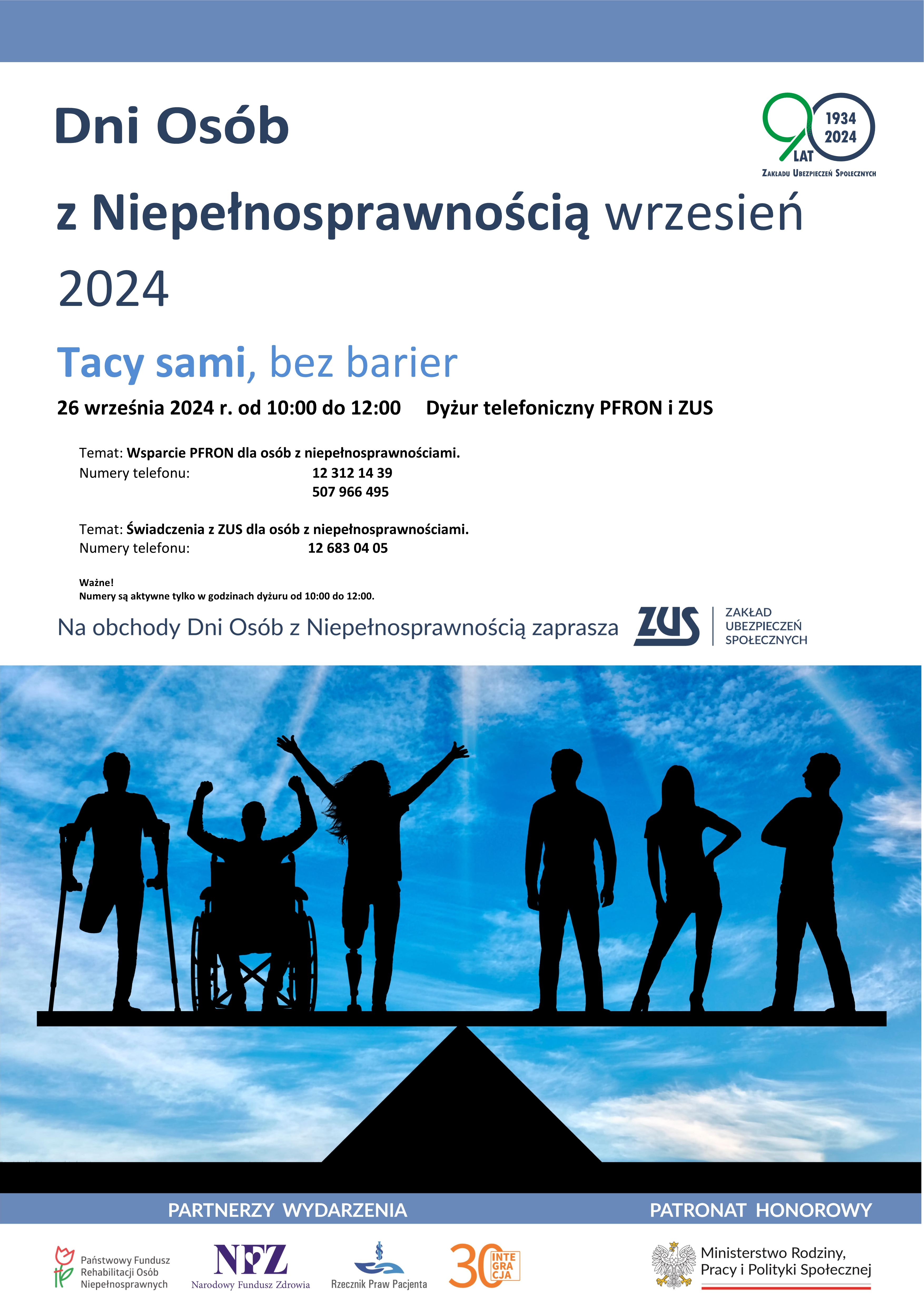 Dyżur telefoniczny PFRON i ZUS 26 września 2024 r. ekspertów PFRON i ZUS organizowanego w ramach Dni Osób z Niepełnosprawnością 26 września 2024 r. od 10:00 do 12:00.