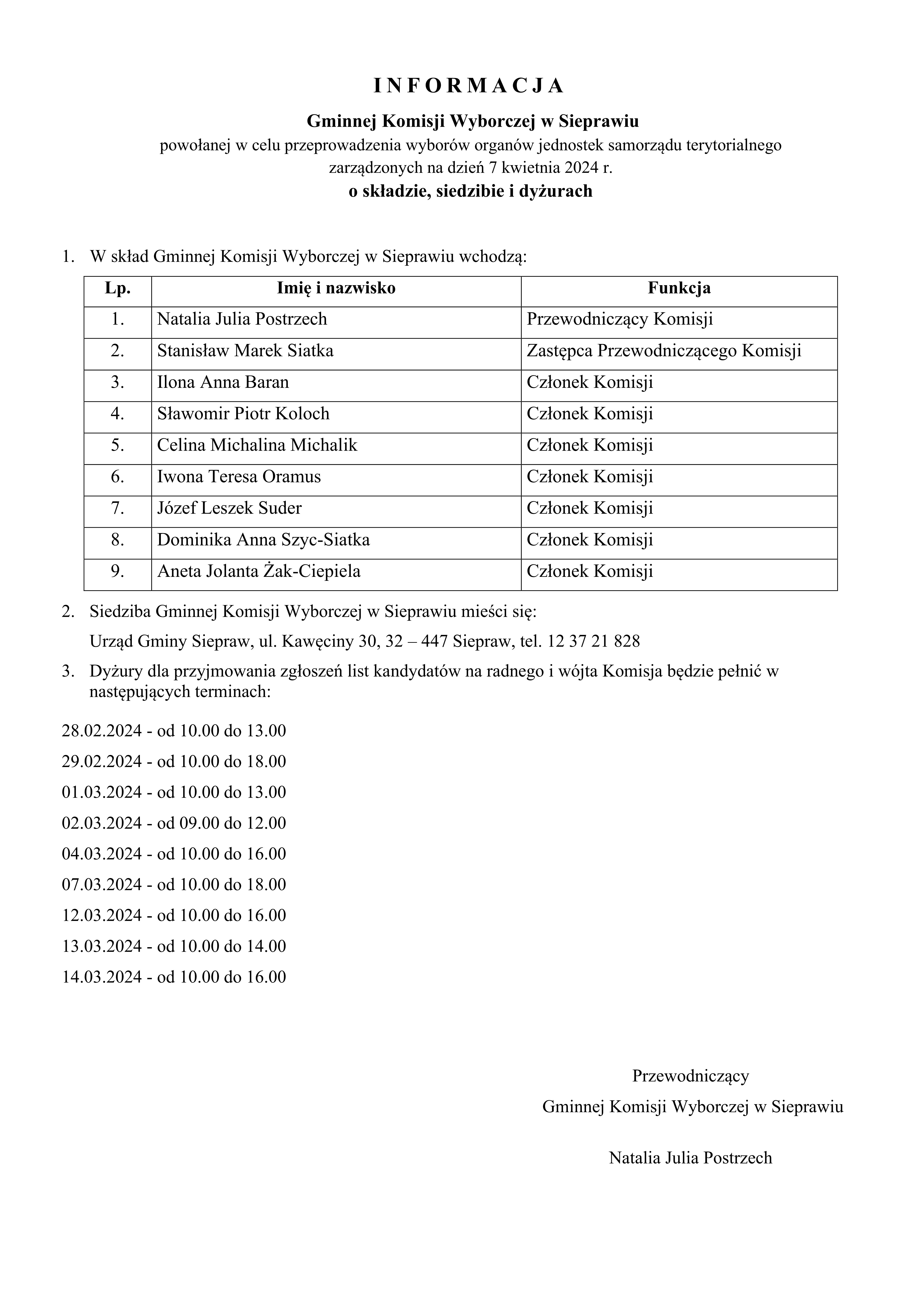 Informacja Gminnej Komisji Wyborczej w Sieprawiu o składzie, siedzibie i dyżurach