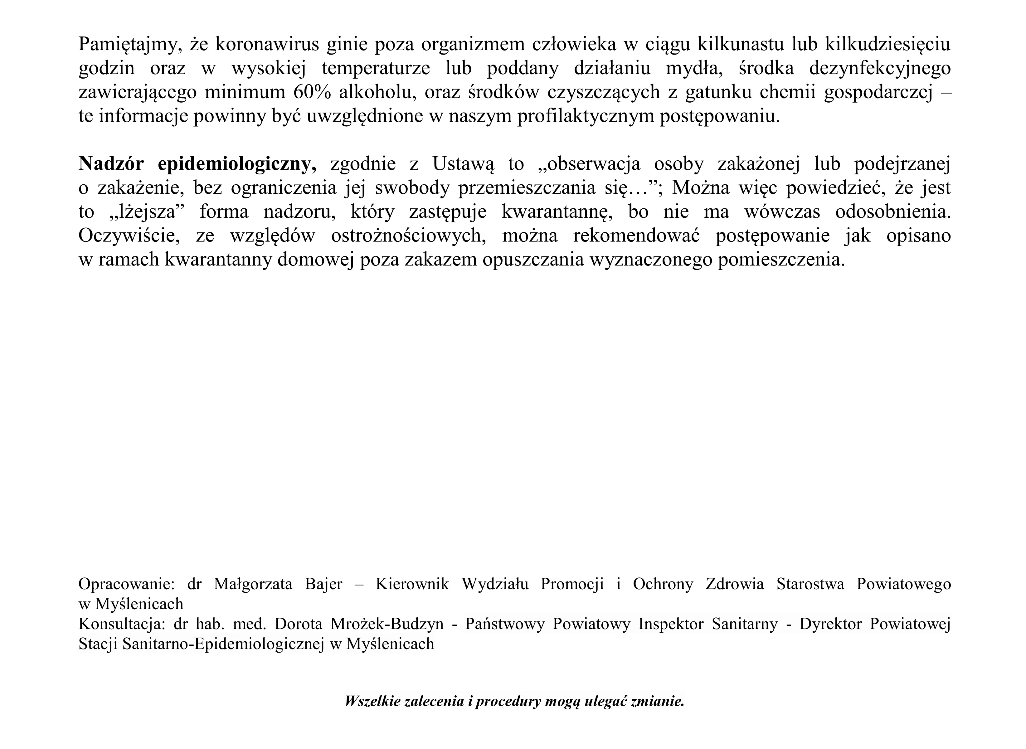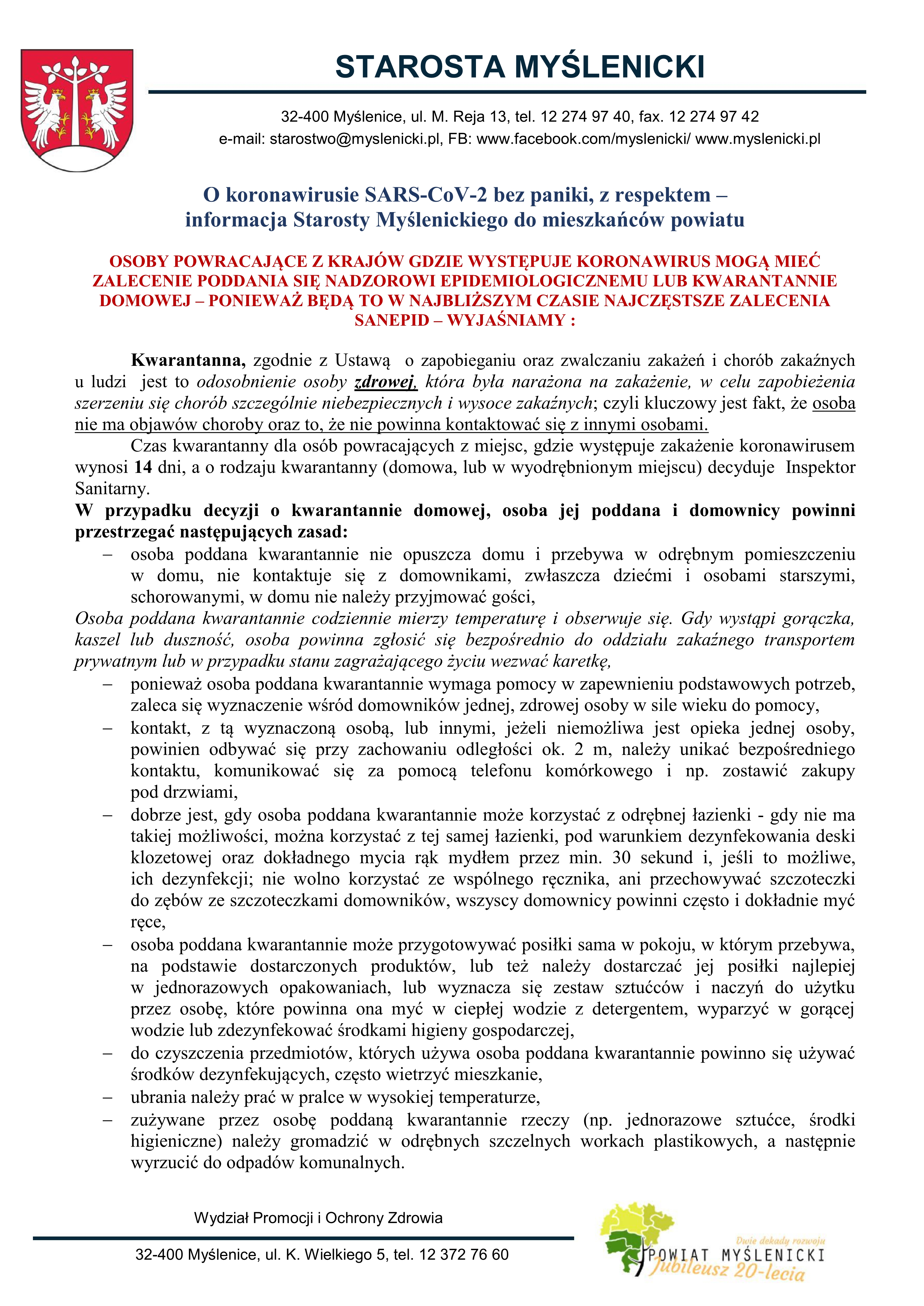 Starosta Myślenicki informuje o zasadach poddania się kwarantannie.
