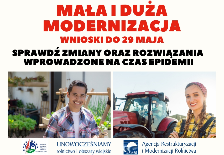 Poniżej dwa komunikaty przekazane przez Myślenickie Biuro Powiatowe Agencji Restrukturyzacji i Modernizacji Rolnictwa o dwóch, trwających do 29 maja naborach, bardzo ważnych dla rolników i rozwoju ich gospodarstw. Komunikaty zawierają także informacje o rozwiązaniach przyjętych przez ARiMR, a związanych z naborami prowadzonymi w stanie epidemii.