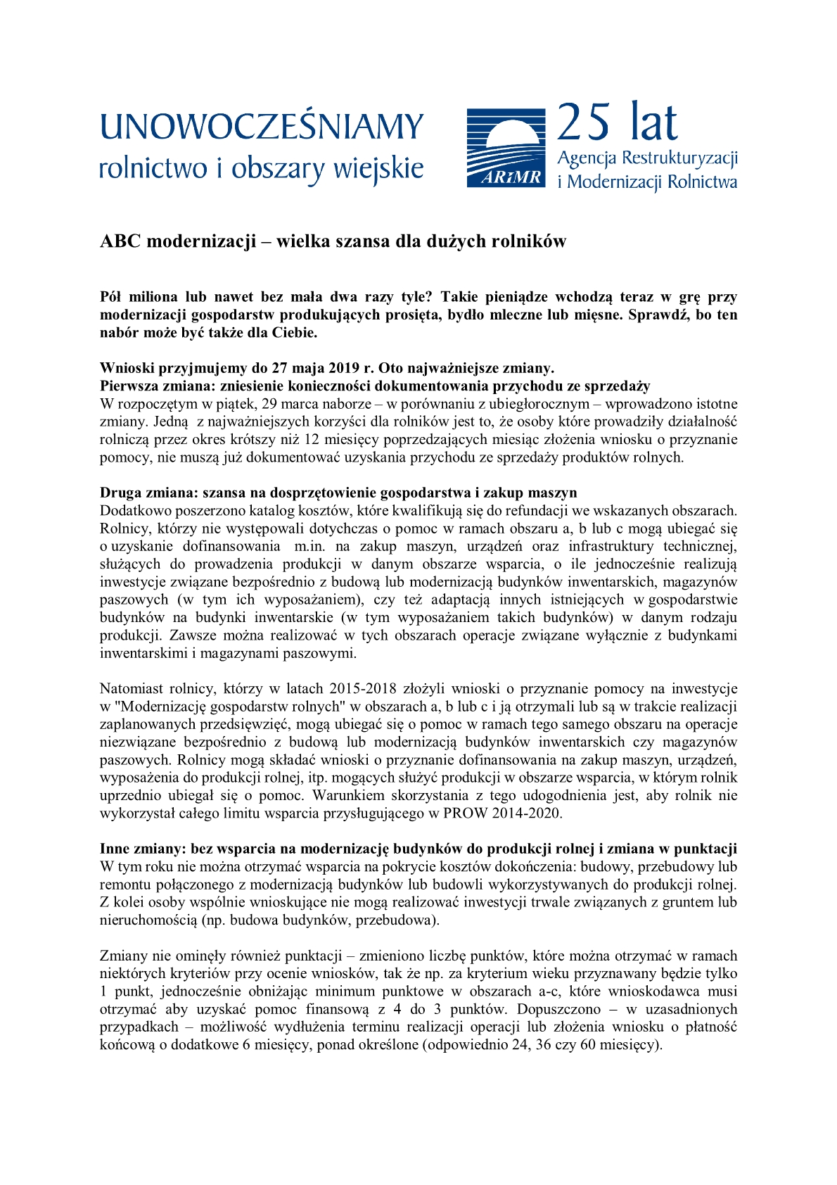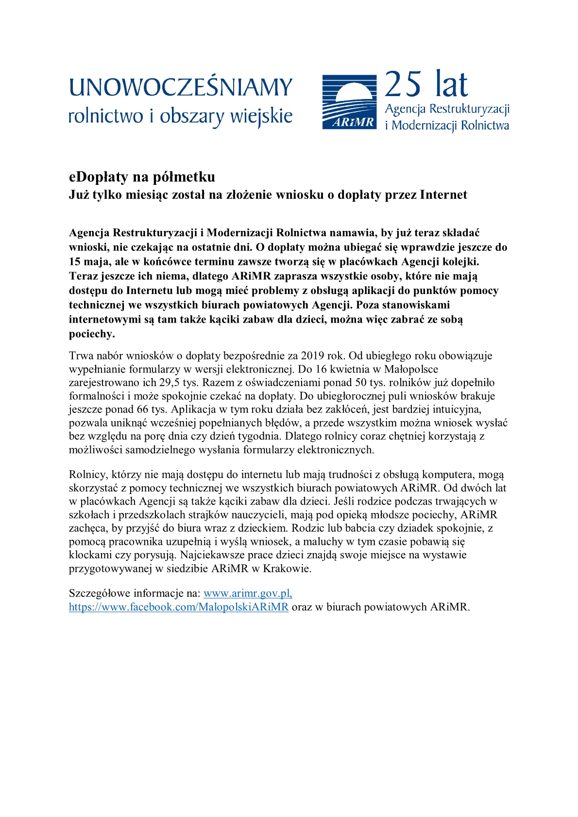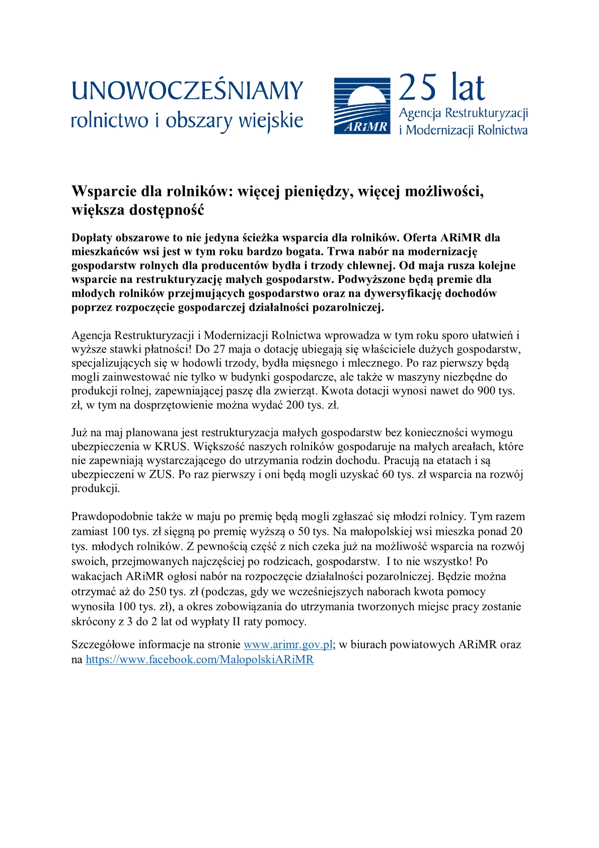 Komunikaty informujące rolników i mieszkańców wsi o ofercie - wdrażanych przez ARiMR - działań pomocowych.