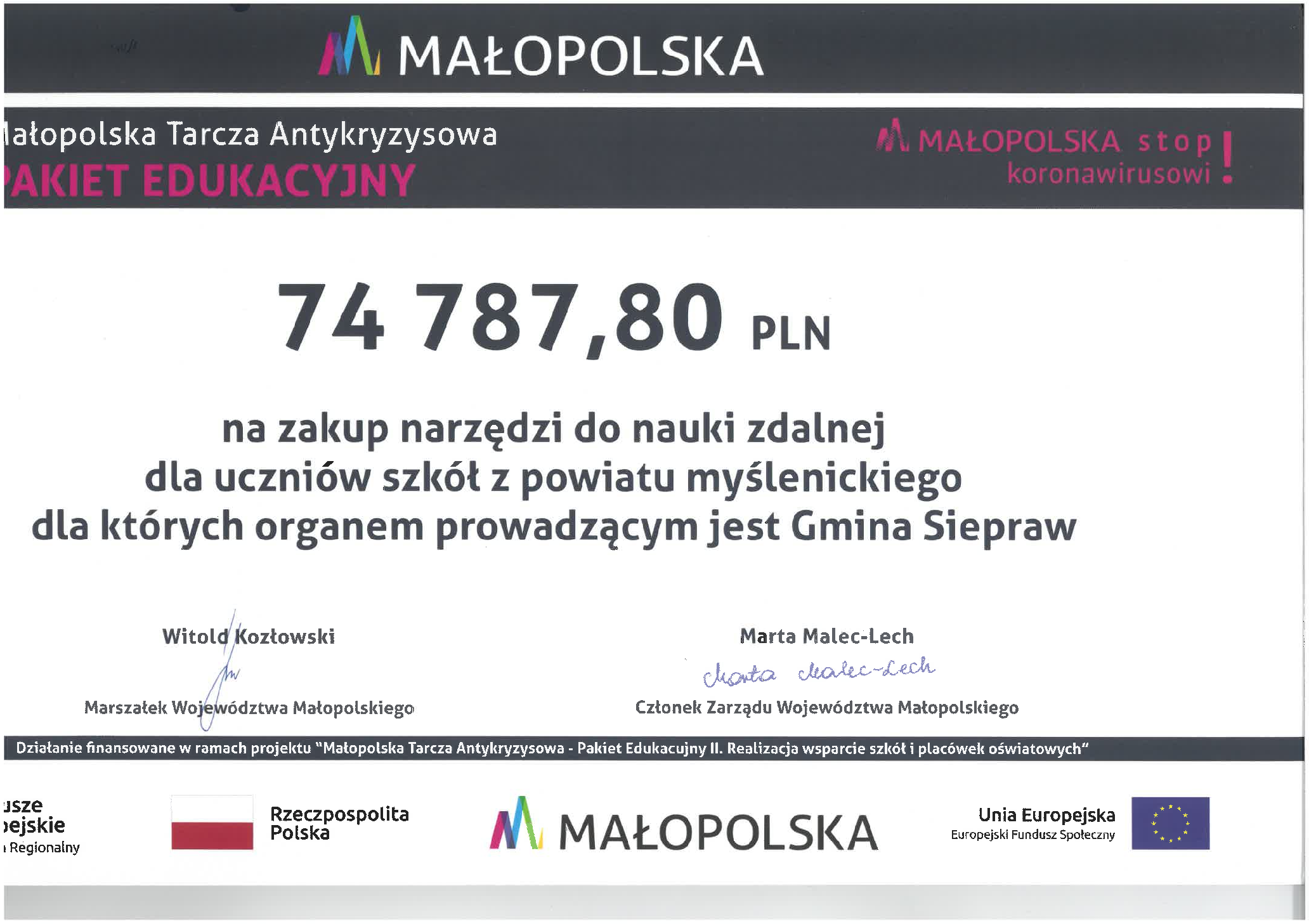 W ramach Projektu pn. „Małopolska Tarcza Antykryzysowa – Pakiet Edukacyjny II. Realizacja wsparcia szkół i placówek oświatowych” Gmina Siepraw otrzymała dofinansowanie w kwocie 74 787,80 zł .