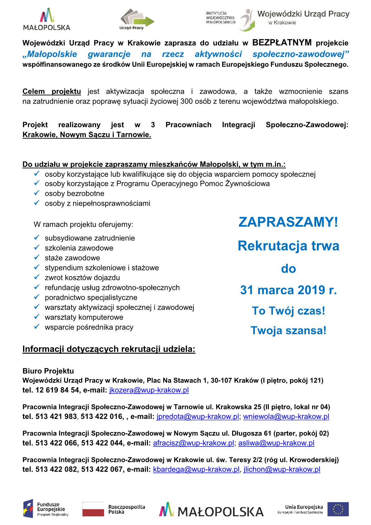 Wojewódzki Urząd Pracy w Krakowie zaprasza do udziału w BEZPŁATNYM projekcie „Małopolskie gwarancje na rzecz aktywności społeczno-zawodowej” współfinansowanego ze środków Unii Europejskiej w ramach Europejskiego Funduszu Społecznego.