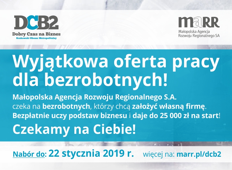 Małopolska Agencja Rozwoju Regionalnego S.A. ogłasza IV nabór do projektu „Dobry Czas na Biznes –KOM2” w ramach 8 Osi Priorytetowej Rynek Pracy, Działanie 8.3 Wsparcie na zakładanie działalności gospodarczej, w Podziałaniu 8.3.1 Wsparcie na zakładanie działalności gospodarczej w formie dotacji, typ operacji A kompleksowe wsparcie dla zakładania działalności gospodarczej w formie dotacji.