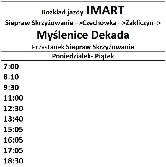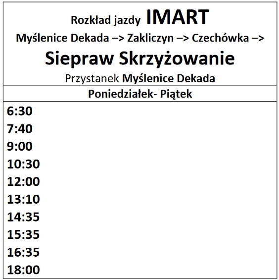 Zgodnie z zapowiedzią od 4 stycznia br. rozpoczyna funkcjonowanie linia bus na trasie Siepraw Skrzyżowanie - Myślenice Dekada, przez Borzętę, Zakliczyn i Czechówkę, którą będzie obsługiwała firma IMART z Trzebuni, po uzyskaniu w dniu dzisiejszym zezwolenia Starosty Myślenickiego.