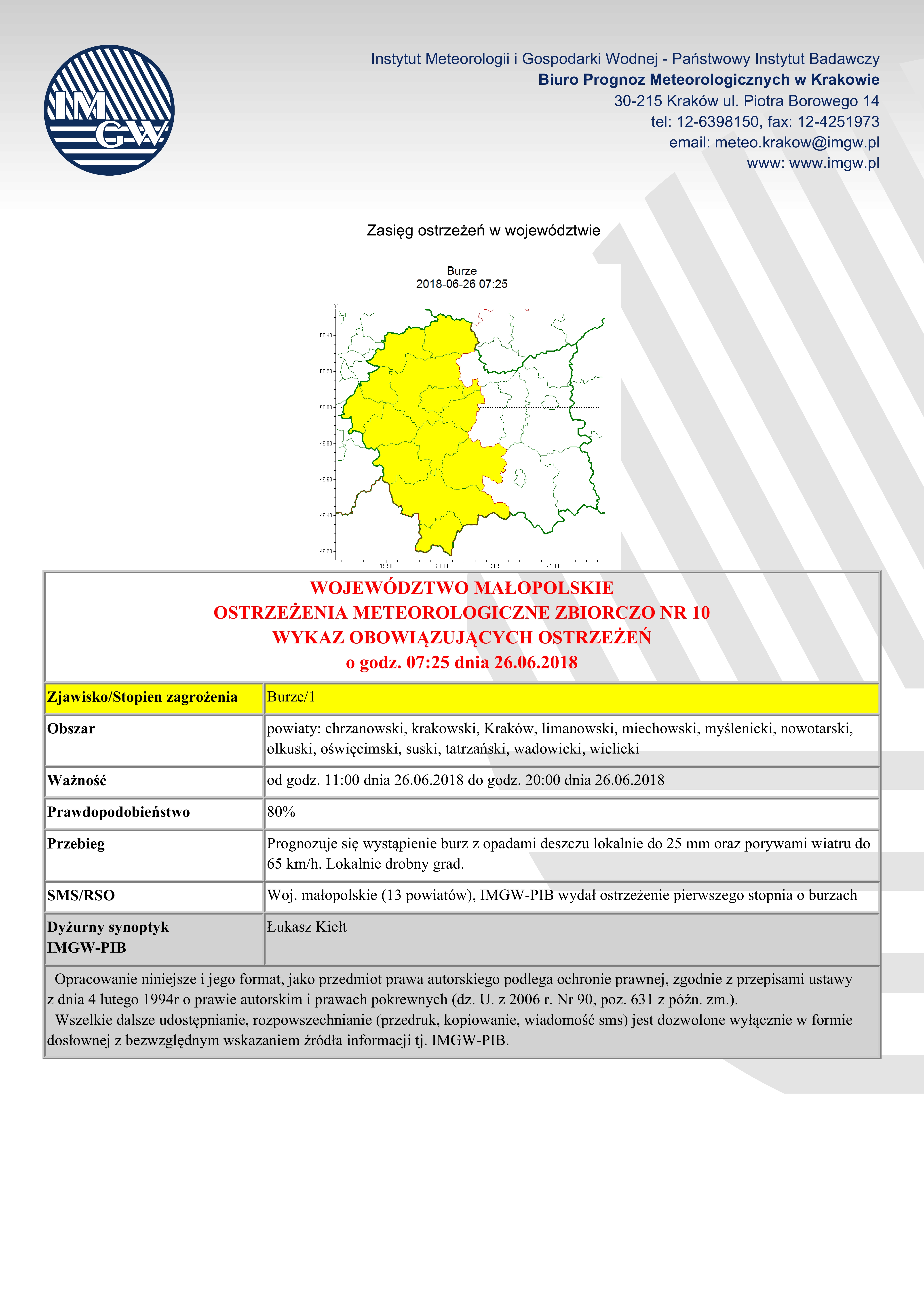 Przebieg: Prognozuje się wystąpienie burz z opadami deszczu lokalnie do 25 mm oraz porywami wiatru do 65 km/h. Lokalnie drobny grad.