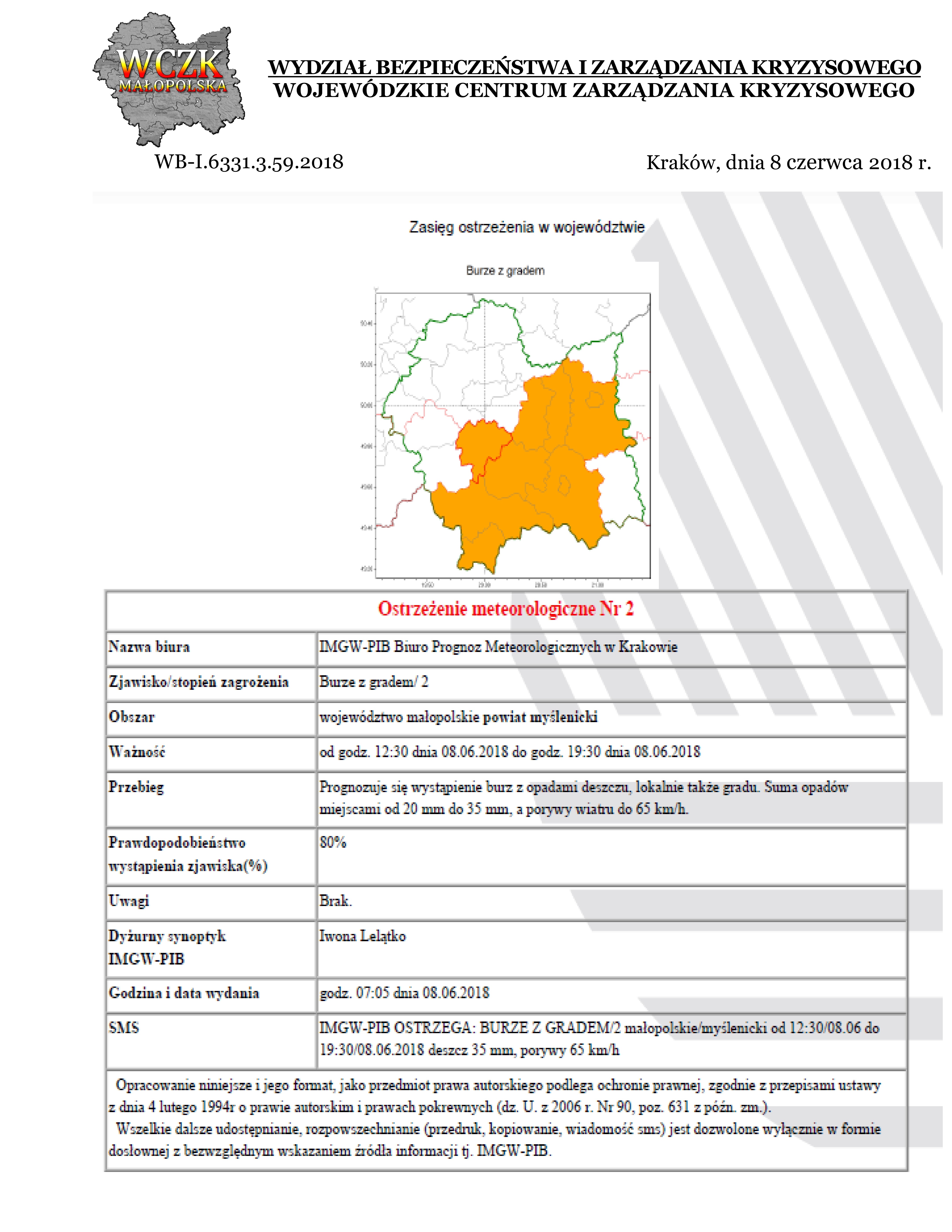także gradu. Suma opadów miejscami od 20 mm do 35 mm, a porywy wiatru do