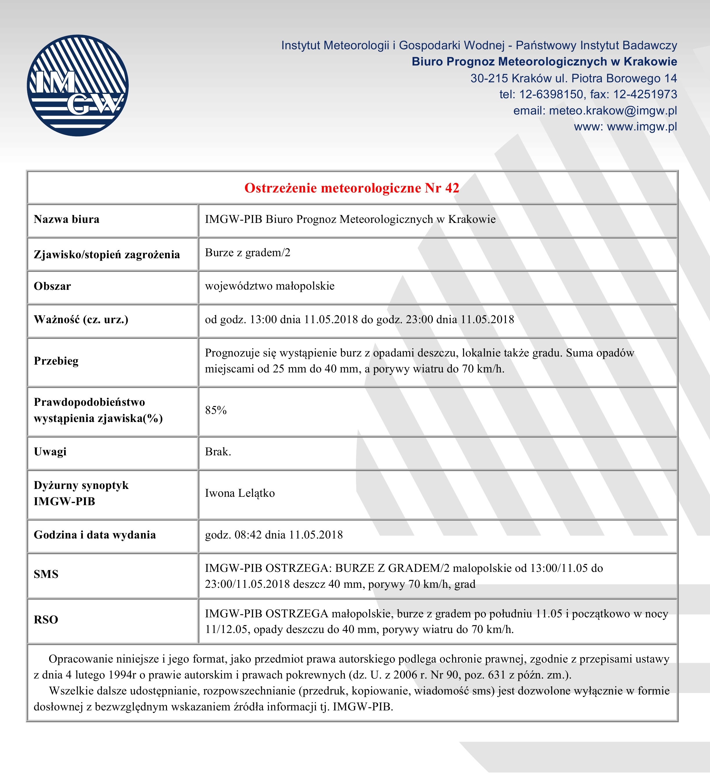 Przebieg: Prognozuje się wystąpienie burz z opadami deszczu, lokalnie także gradu. Suma opadów miejscami od 25 mm do 40 mm, a porywy wiatru do 70 km/h.