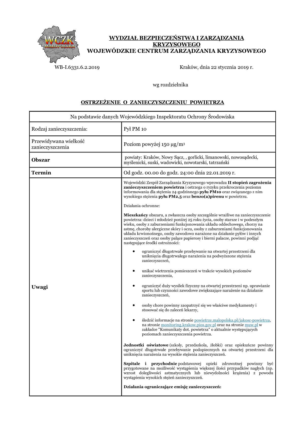 Wojewódzki Zespół Zarządzania Kryzysowego wprowadza II stopień zagrożenia zanieczyszczeniem powietrza i ostrzega o ryzyku przekroczenia poziomu informowania dla stężenia 24-godzinnego pyłu PM10 oraz związanego z nim wysokiego stężenia pyłu PM2,5 oraz benzo(a)pirenu w powietrzu.